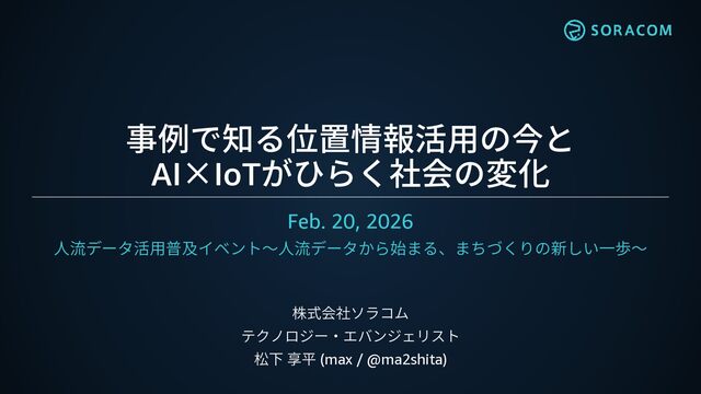 事例で知る位置情報活用の今と AI×IoTがひらく社会の変化 Feb. 20, 2026 人流データ活用普及イベント~人流データから始まる、まちづくりの新しい一歩~ 株式会社ソラコム テクノロジー・エバンジェリスト 松下 享平