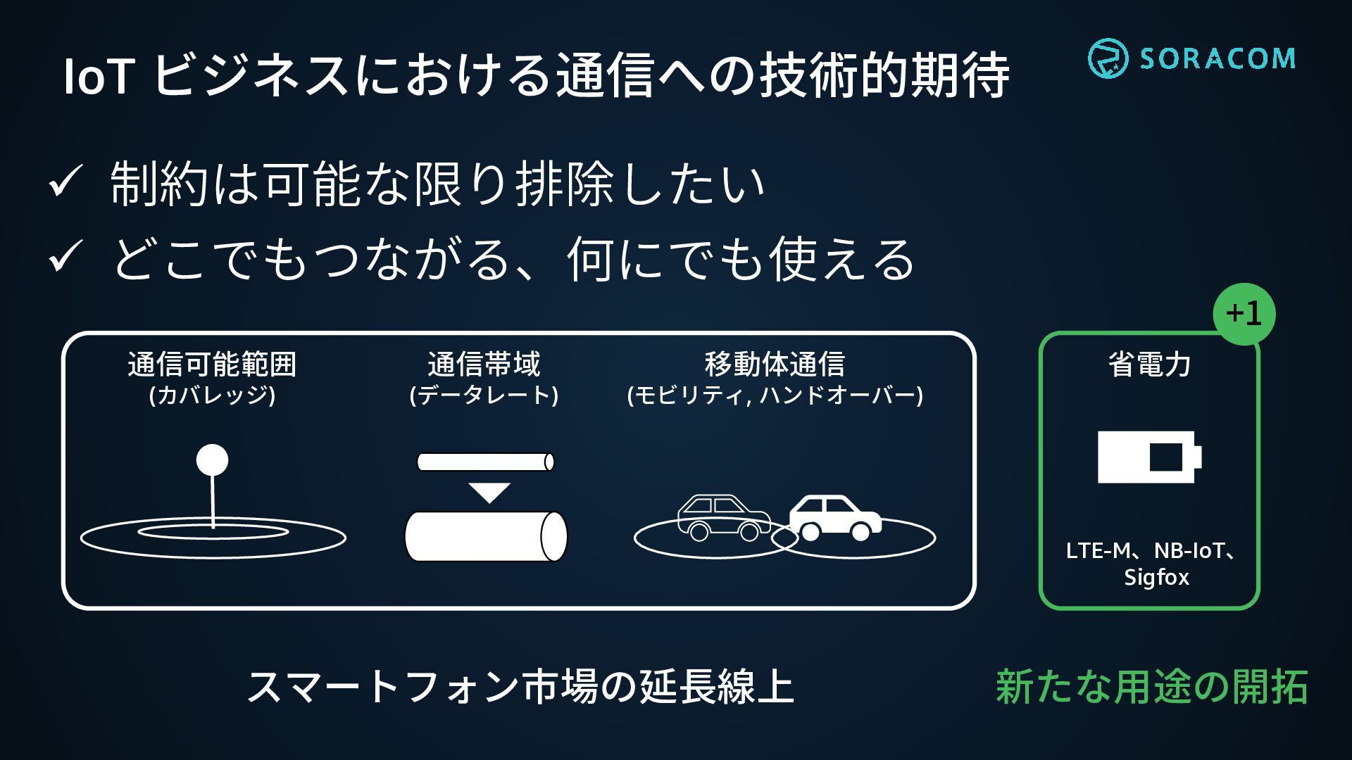 ハンドオーバー) 通信可能範囲 (カバレッジ) 新たな用途の開拓 省電力 +1 スマートフォン市場の延長線上 LTE-M、NB-IoT、 Sigfox