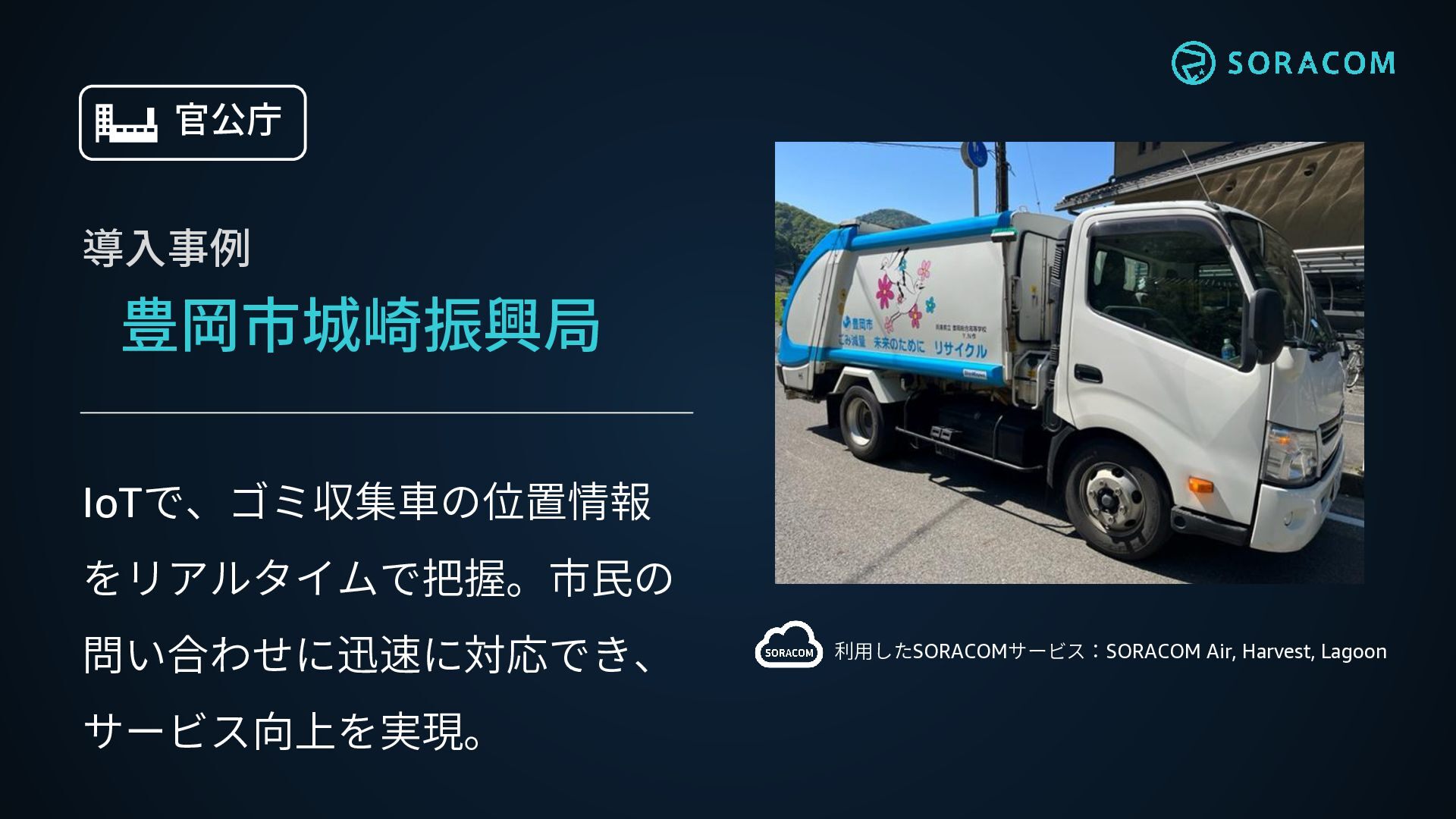豊岡市城崎振興局 IoTで、ゴミ収集車の位置情報 をリアルタイムで把握。市民の 問い合わせに迅速に対応でき、 サービス向上を実現。 利用したSORACOMサービス:SORACOM Air, Harvest, Lagoon 導入事例