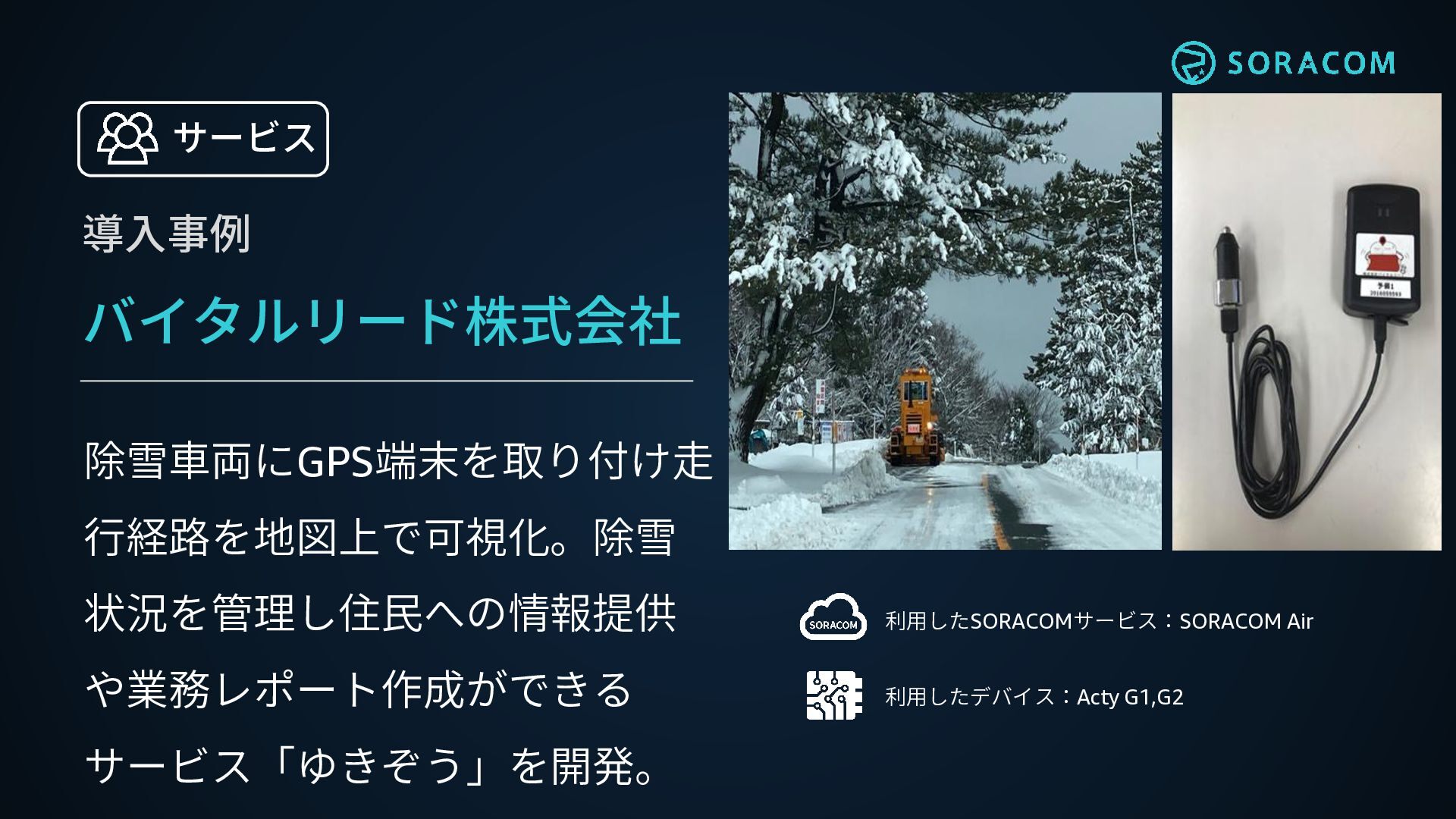 バイタルリード株式会社 除雪車両にGPS端末を取り付け走 行経路を地図上で可視化。除雪 状況を管理し住民への情報提供 や業務レポート作成ができる サービス「ゆきぞう」を開発。 サービス 導入事例 利用したSORACOMサービス:SORACOM Air