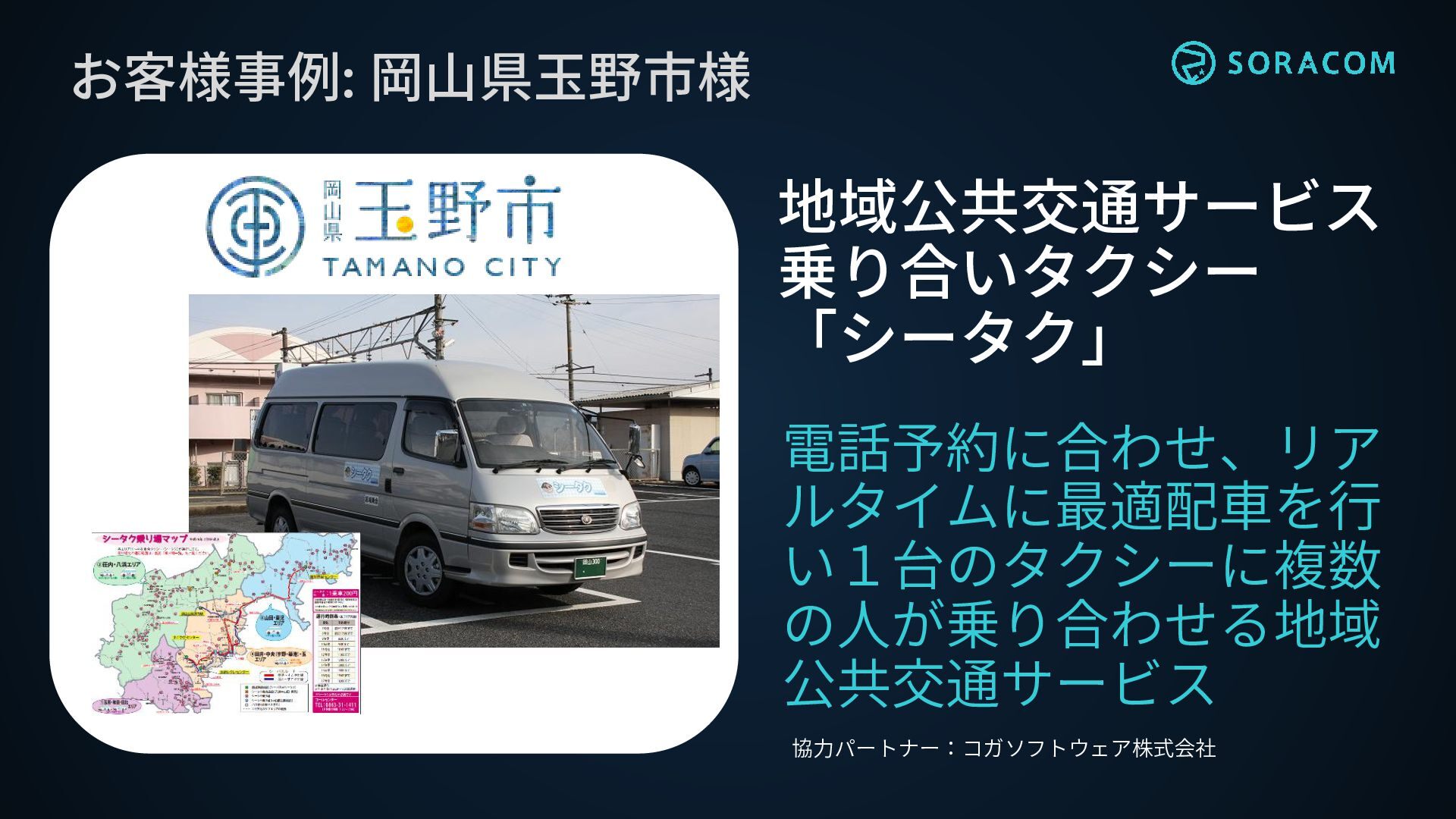 お客様事例: 岡山県玉野市様 電話予約に合わせ、リア ルタイムに最適配車を行 い1台のタクシーに複数 の人が乗り合わせる地域 公共交通サービス 地域公共交通サービス 乗り合いタクシー 「シータク」