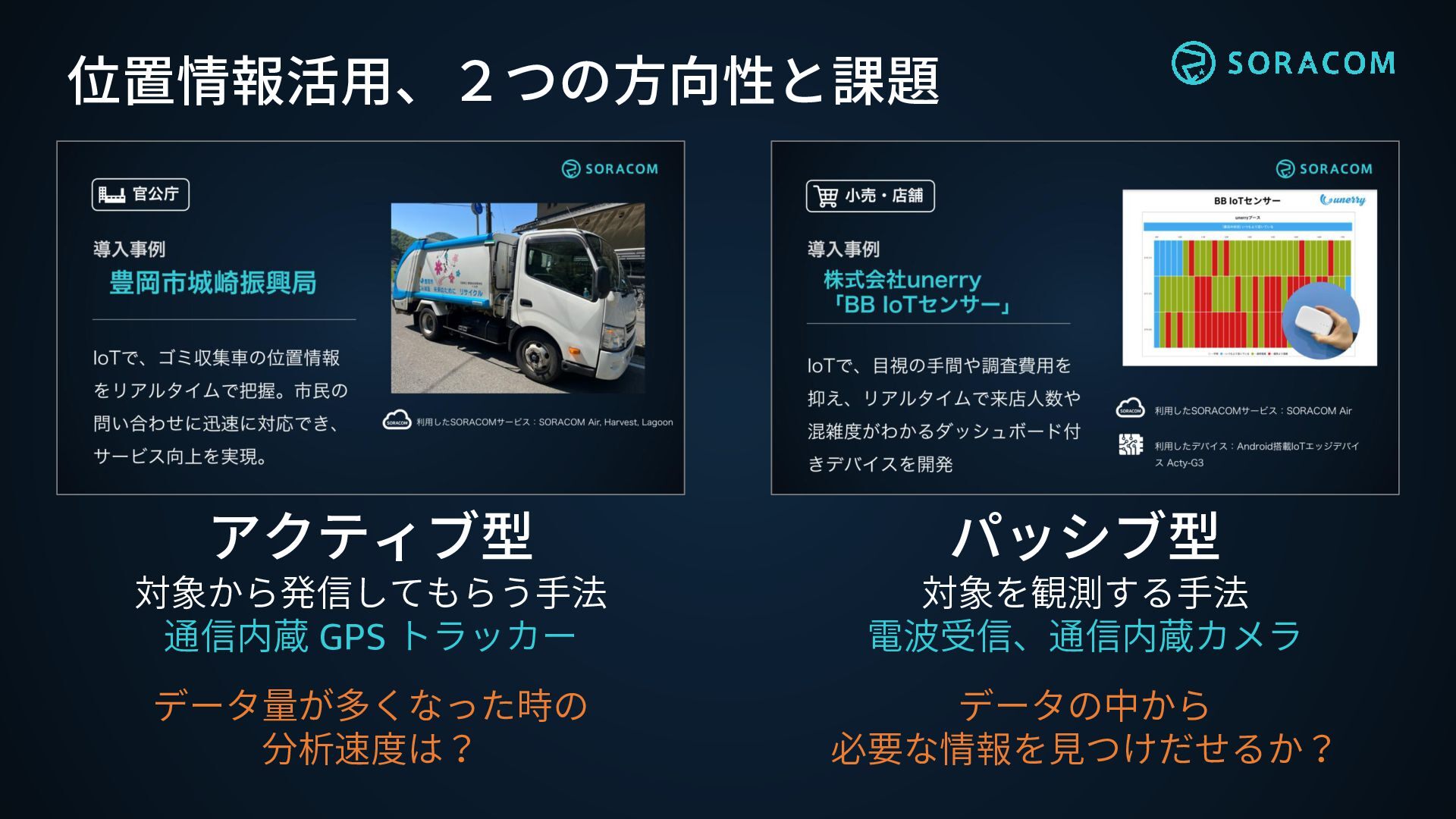 位置情報活用、2つの方向性と課題 アクティブ型 対象から発信してもらう手法 通信内蔵 GPS トラッカー パッシブ型 対象を観測する手法 電波受信、通信内蔵カメラ データ量が多くなった時の