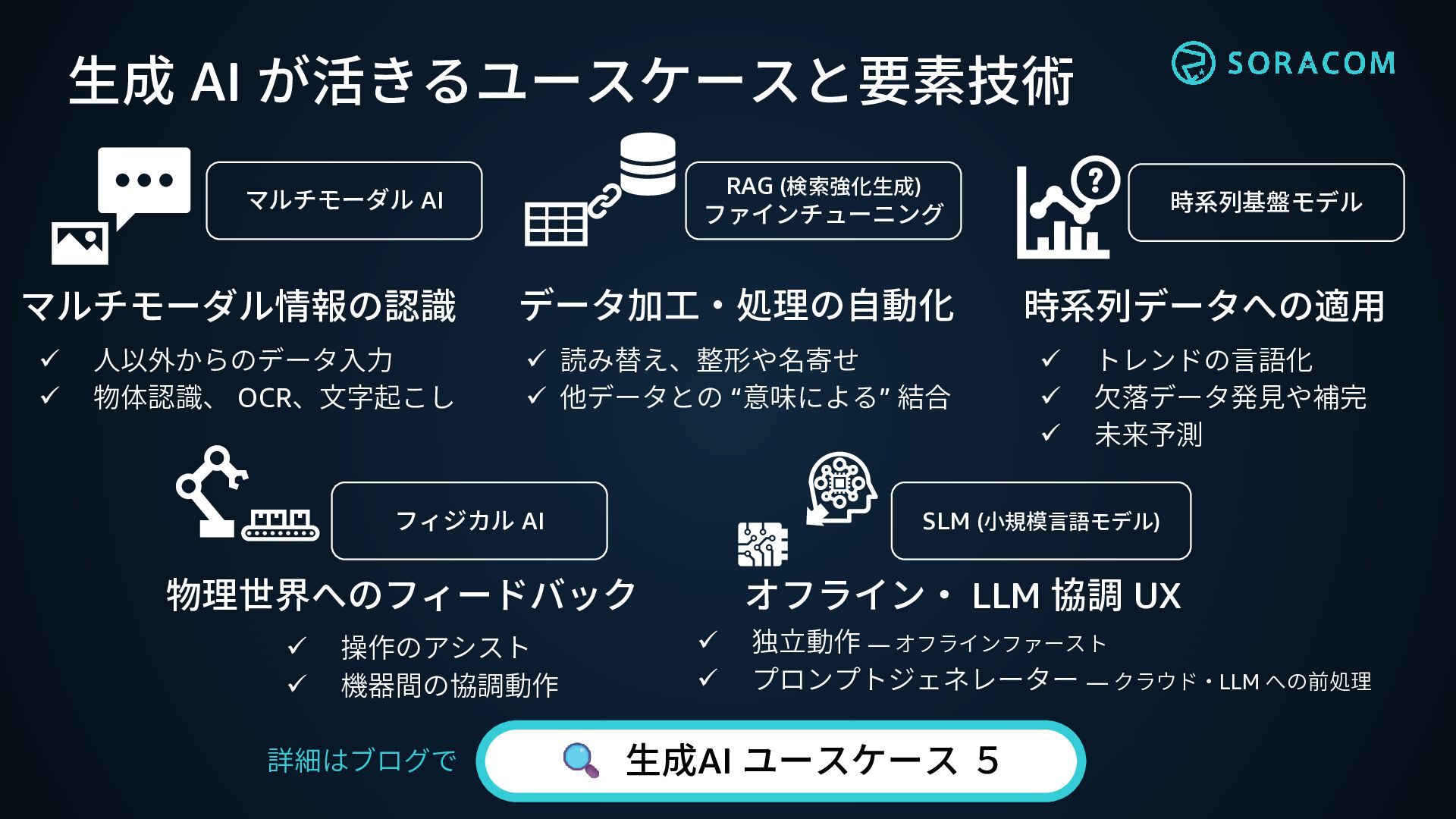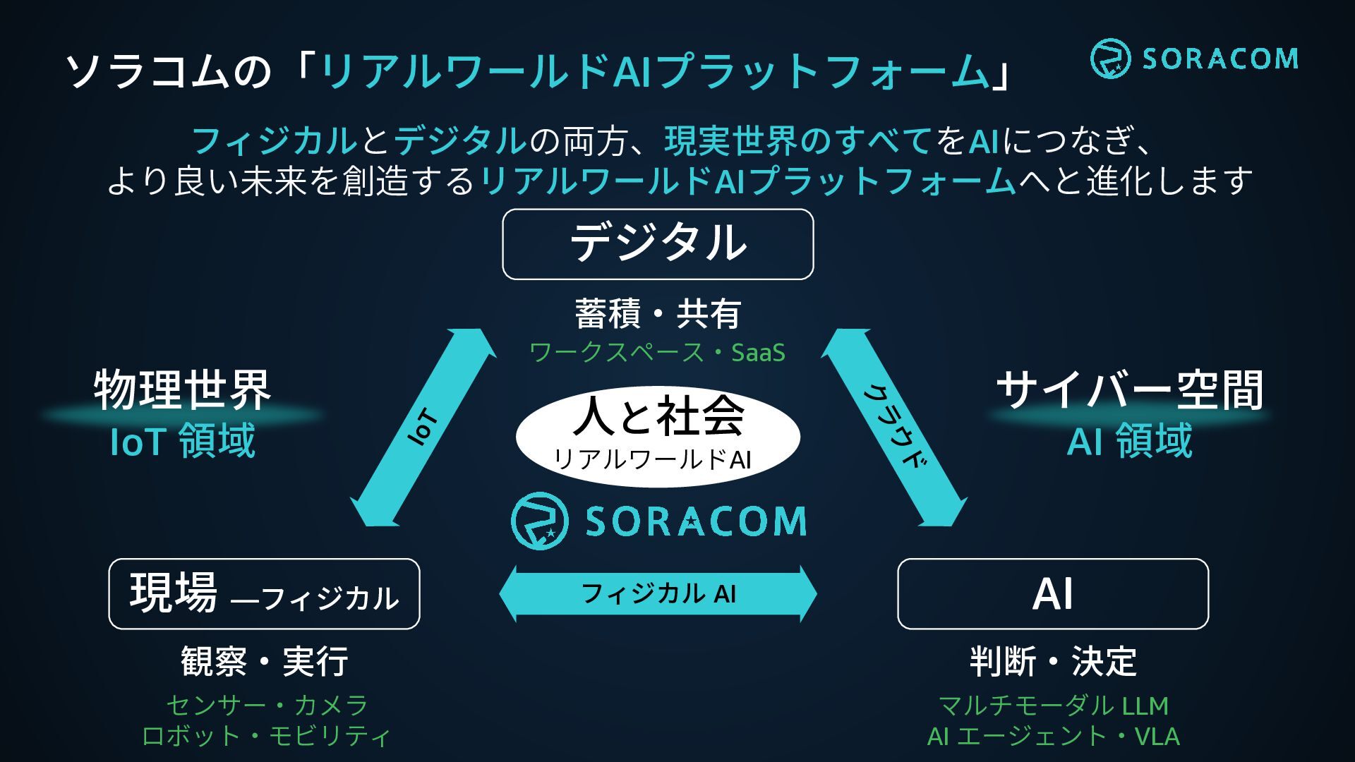 ロボット・モビリティ マルチモーダル LLM AI エージェント・VLA ワークスペース・SaaS フィジカルとデジタルの両方、現実世界のすべてをAIにつなぎ、 より良い未来を創造するリアルワールドAIプラットフォームへと進化します ソラコムの「リアルワールドAIプラットフォーム」 人と社会 リアルワールドAI 物理世界 IoT 領域 サイバー空間 AI 領域