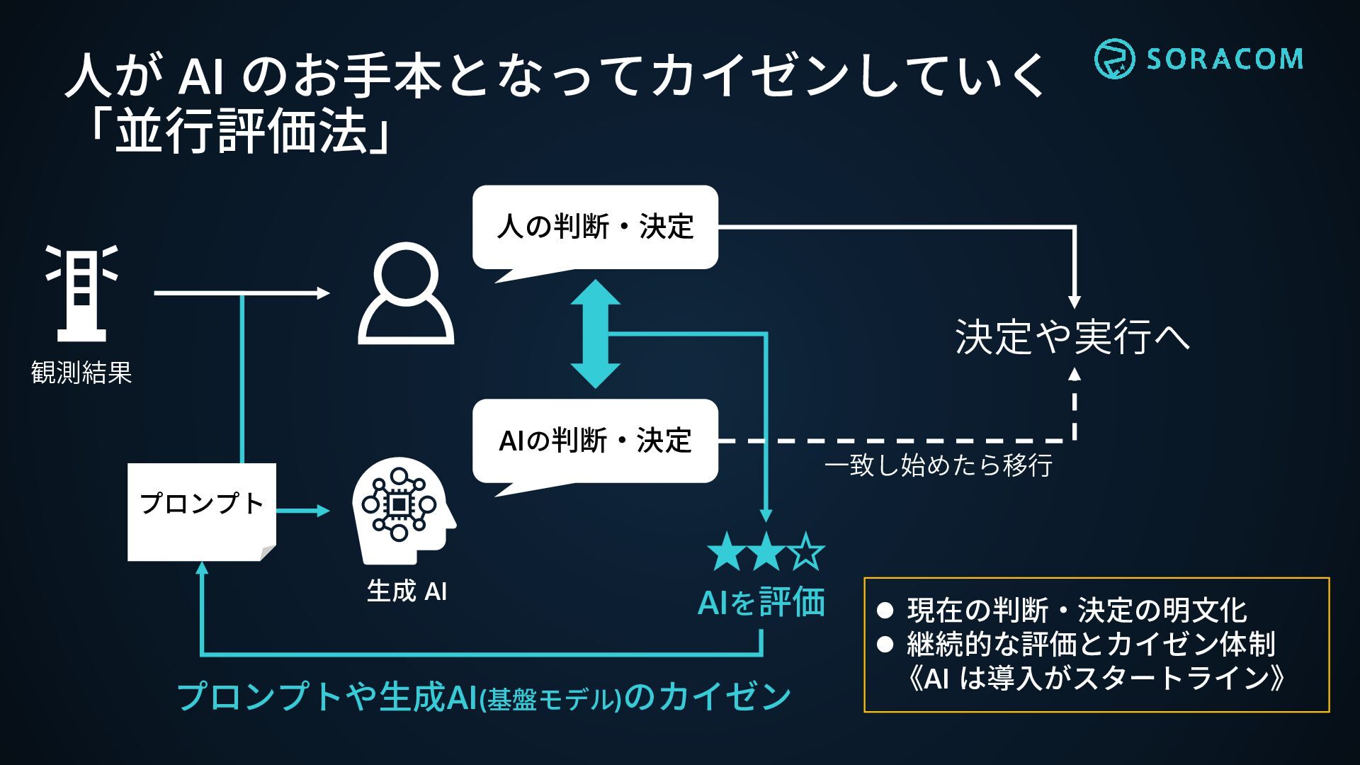 人が AI のお手本となってカイゼンしていく 「並行評価法」 AIの判断・決定 人の判断・決定 観測結果 AIを評価 プロンプト 決定や実行へ