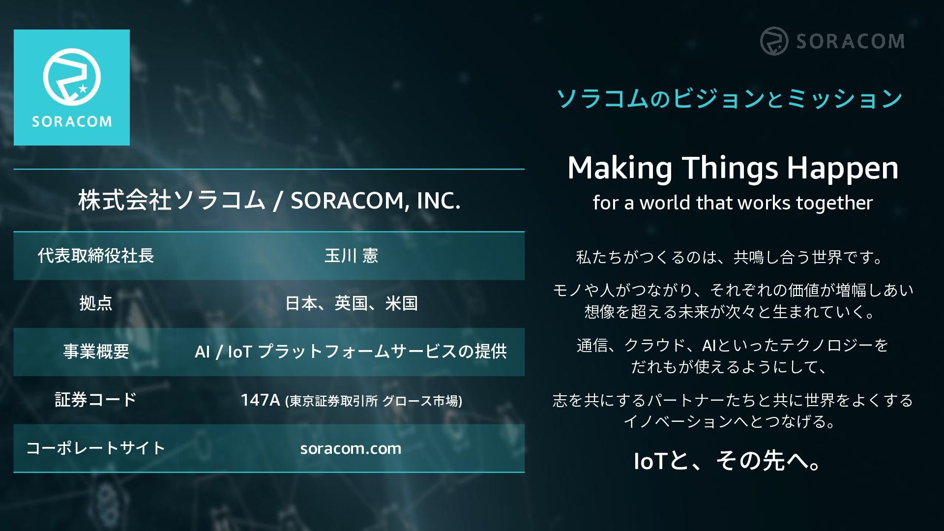 私たちがつくるのは、共鳴し合う世界です。 モノや人がつながり、それぞれの価値が増幅しあい 想像を超える未来が次々と生まれていく。 通信、クラウド、AIといったテクノロジーを だれもが使えるようにして、 志を共にするパートナーたちと共に世界をよくする イノベーションへとつなげる。 IoTと、その先へ。 株式会社ソラコム / SORACOM, INC. 代表取締役社長 玉川 憲 拠点 日本、英国、米国 事業概要 AI / IoT プラットフォームサービスの提供 証券コード 147A (東京証券取引所 グロース市場) コーポレートサイト soracom.com