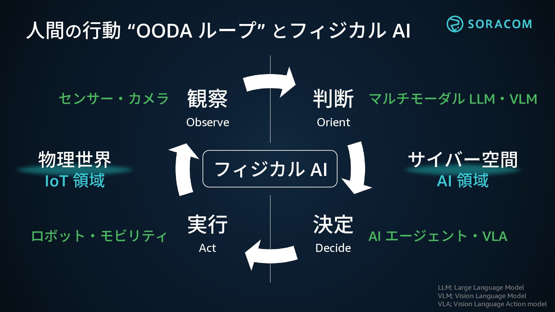ループ” とフィジカル AI センサー・カメラ ロボット・モビリティ マルチモーダル LLM・VLM AI エージェント・VLA LLM; Large Language Model VLM; Vision Language Model VLA; Vision Language Action model 物理世界 IoT 領域 サイバー空間 AI 領域 フィジカル AI