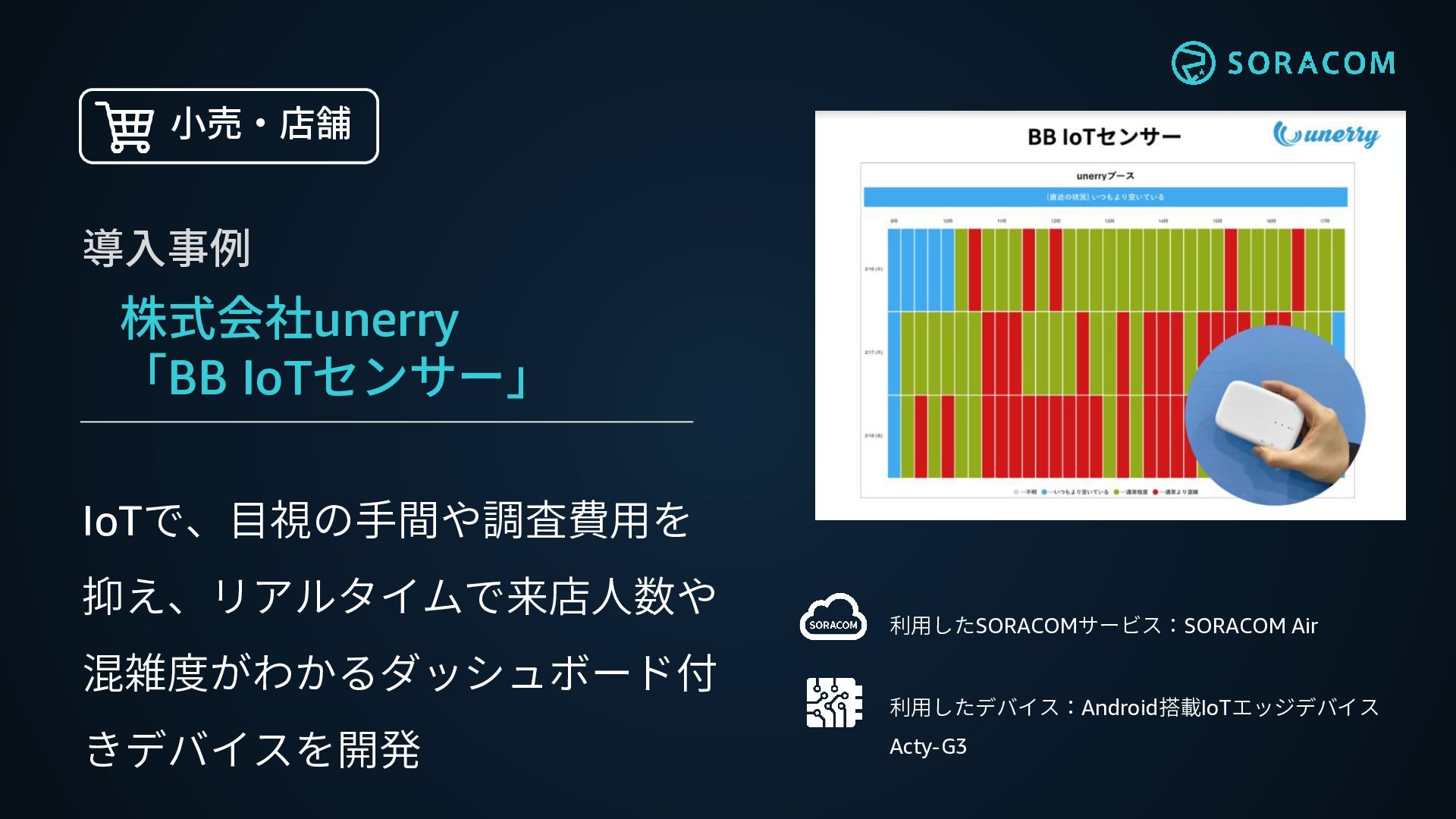 株式会社unerry 「BB IoTセンサー」 IoTで、目視の手間や調査費用を 抑え、リアルタイムで来店人数や 混雑度がわかるダッシュボード付 きデバイスを開発 利用したSORACOMサービス:SORACOM Air 利用したデバイス:Android搭載IoTエッジデバイス