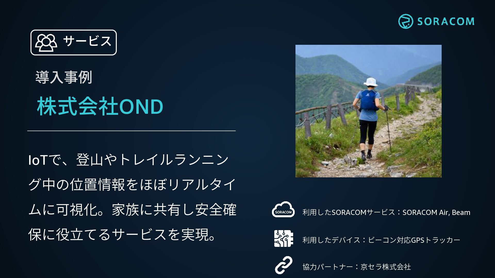 株式会社OND IoTで、登山やトレイルランニン グ中の位置情報をほぼリアルタイ ムに可視化。家族に共有し安全確 保に役立てるサービスを実現。 利用したSORACOMサービス:SORACOM Air, Beam 利用したデバイス:ビーコン対応GPSトラッカー 協力パートナー:京セラ株式会社