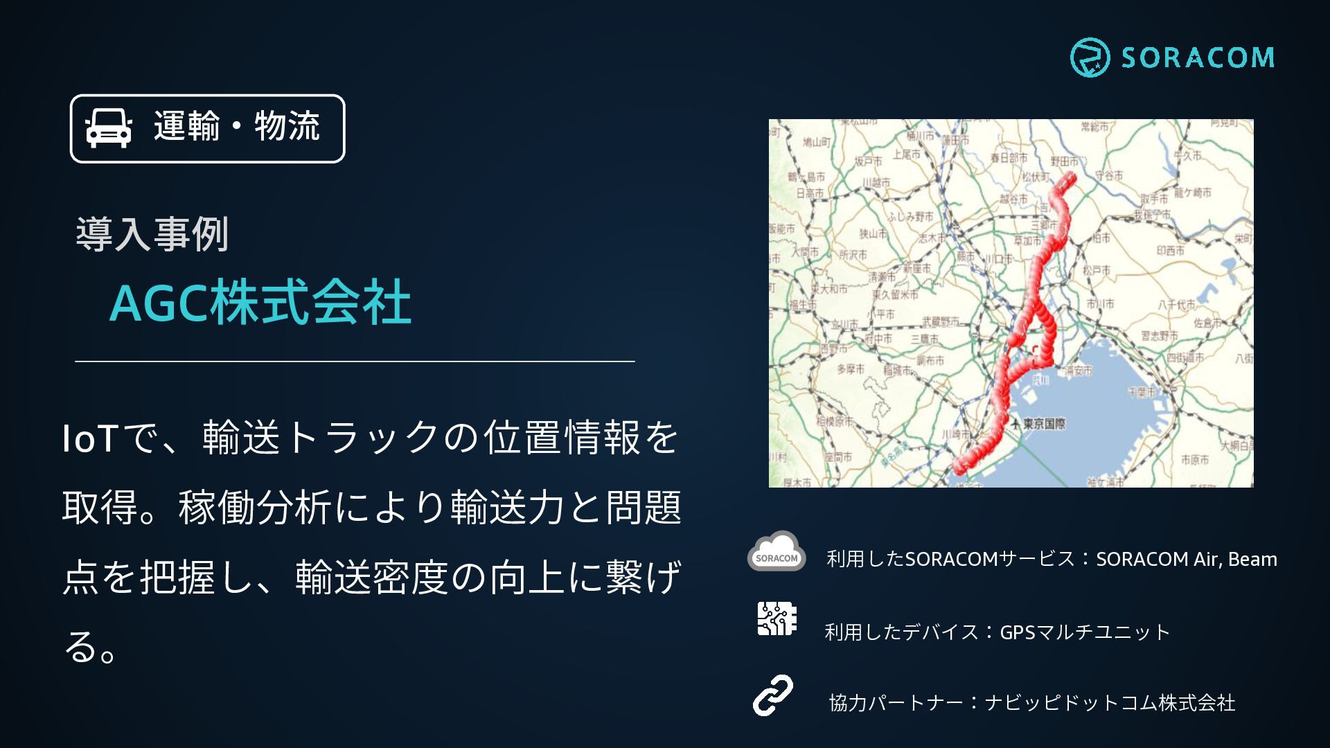 AGC株式会社 IoTで、輸送トラックの位置情報を 取得。稼働分析により輸送力と問題 点を把握し、輸送密度の向上に繋げ る。 利用したSORACOMサービス:SORACOM Air, Beam 導入事例 運輸・物流