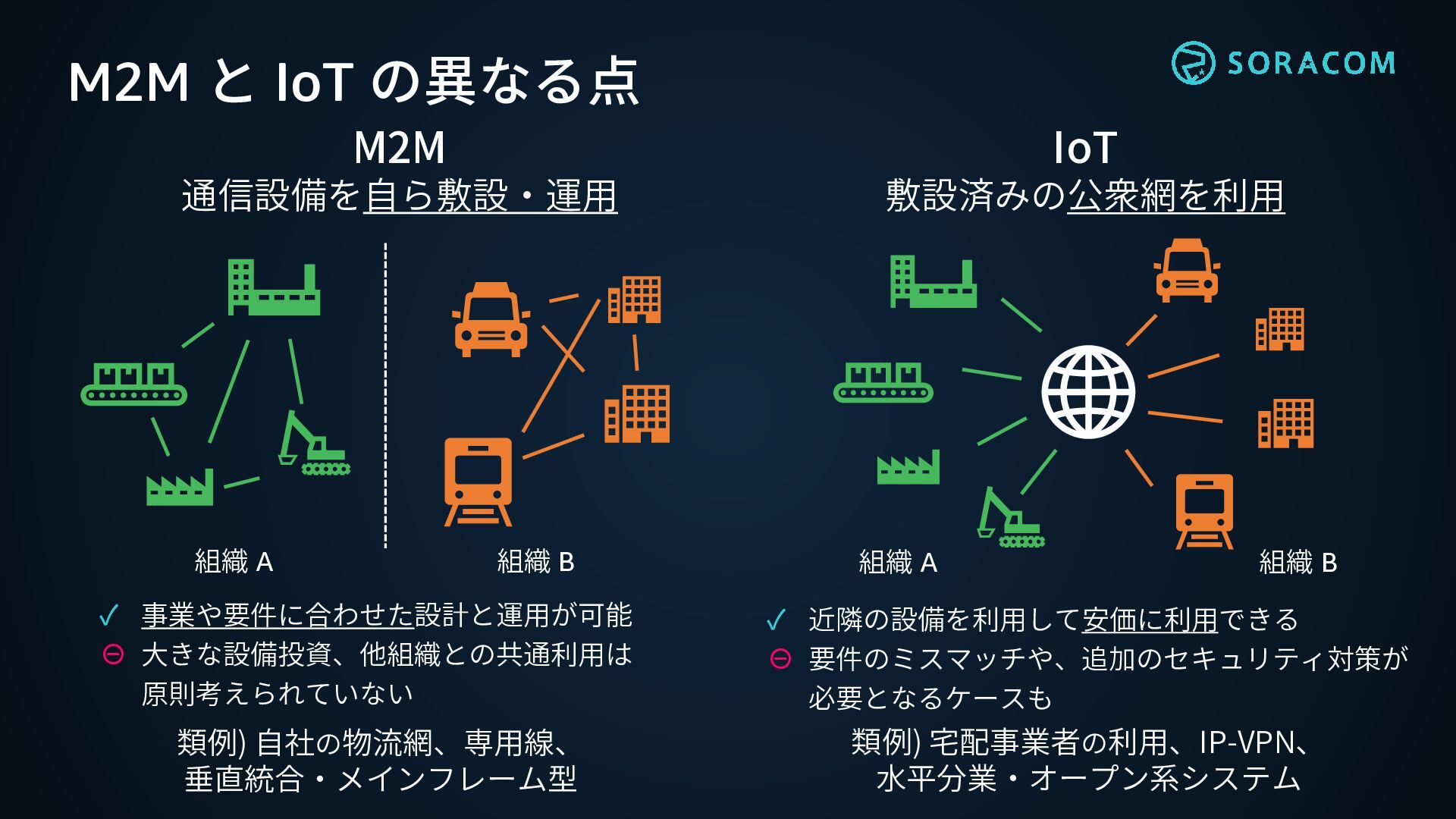 M2M と IoT の異なる点 M2M 通信設備を自ら敷設・運用 IoT 敷設済みの公衆網を利用 ✓ 事業や要件に合わせた設計と運用が可能