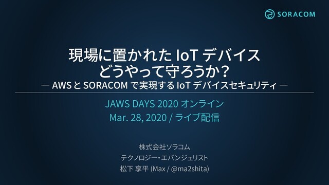 JAWS DAYS 2020 オンラインで、ソラコムのテクノロジー・エバンジェリスト 松下(ニックネーム=Max)が発表した IoT デバイスセキュリティのリスク分析から対策の考え方、SORACOM Beam/Funnel/Funk や SORACOM Junction、 AWS IoT Device Defender の解説をしています。
