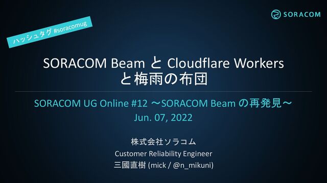 2022年6月7日(火)開催のSORACOM UG Online #12 ~SORACOM Beamの再発見で、ソラコム Customer Reliability Engineer 三國直樹(mick) が発表した「SORACOM BeamとCloudflare Workersと、梅雨の布団」の公開資料