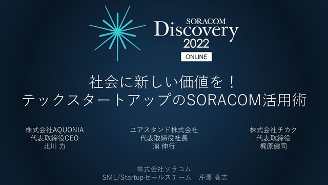 本セッションでは社会に新しい価値を提供しているテクノロジースタートアップに、ビジョンや取り組みの背景、アイディアから育った製品・サービス、新しい価値を市場に届けるモチベーションについて伺います。 また、迅速な市場へのサービス提供を可能にするIoTプラットフォームSORACOMの活⽤⽅法、さらにはユーザーやパートナーエコシステムを含むコミュニティや、アーキテクチャ設計やプロダクト量産の⽀援体制など、ソラコムのスタートアップ⽀援体制をご紹介します。