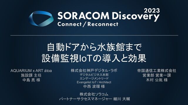 様 株式会社神戸デジタル・ラボ デジタルビジネス本部 エンゲージメントリード Evangelist IoT / Architect 中西 波瑠 様 帝国通信工業株式会社 営業部 営業一課 木村 公胤 様 株式会社ソラコム パートナーサクセスマネージャー 細川 大輔