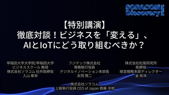 AIは社会を"変える"キーテクノロジーであり、この流れを加速するのがIoTです。IoTで得たデータをAIで活用・分析し、ビジネスの判断をする時代がきています。早稲田大学の入山教授、フジテックのデジタル変革を率いCIOの役割定着と情報化社会の発展に尽力する友岡氏、AIの社会実装に取り組む株式会社松尾研究所で経営戦略を担う金氏を迎え、AIとIoTへ取り組むべき理由や踏み出し方を考えていきます。