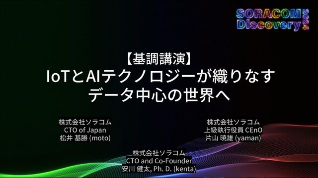SORACOMのテクノロジーをリードするCTO安川を含めた3名が、IoTの先駆者であるゲストを交えて、すでに始まっているIoTとAIによる「データ中心へ変わる世界」をご紹介します。データ収集に不可欠なIoTと、集めたデータをAIと共に活かす道筋について、IoTの未来に期待するエンジニアの皆さんと考えていきます。