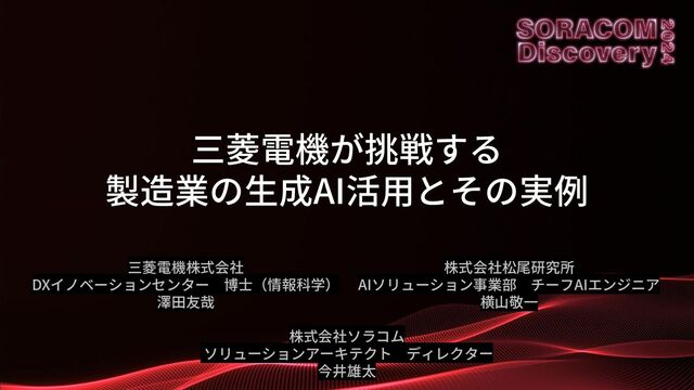 ChatGPTを筆頭に様々な生成AIが簡単に利用できるようになり、製造業でも新たな活用が進んでいます。三菱電機の製品開発にIoTと生成AIを活用するプロジェクトをソラコムと株式会社松尾研究所が共同支援する事例について、チーム作りやテーマ選定のプロセスなどに焦点を当てながらご紹介します。