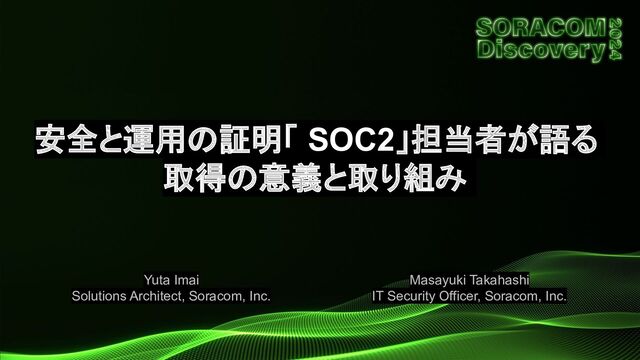 SOC2とはプラットフォームやサービスのセキュリティや運用、事業継続性などを公に証明するひとつの手段であり、SORACOMもこれを取得しています。なぜSOC2は重要なのか、実際にどのような取り組みをしているのか、担当者とともに改めて紐解きながらSORACOMの運用や安全性についてお話します。