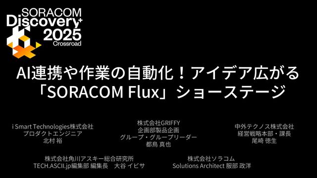 Fluxを 使った目視業務効率化の紹介] 中外テクノス 尾崎様 • #2 [生成AIが変える建設現場の常識] GRIFFY 都鳥様 • #3 [SORACOM Fluxで省エネ体質改善はじめました] i Smart Technology 北村様 • 参加者投票 @ slido • 講評:角川アスキー総合研究所 大谷様 & ソラコム服部