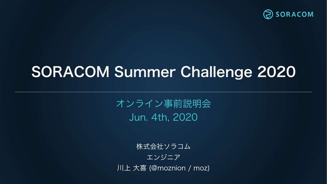 2020年6月4日(木)に開催した SORCOM Summer Challenge 2020 事前説明会資料です。 SORACOM Summer Challenge 2020は、2週間にわたり、SORACOM プラットフォームを用いて「暮らしを豊かにする IoT システム」の構築にチャレンジしていただくハッカソンスタイルのイベントです。