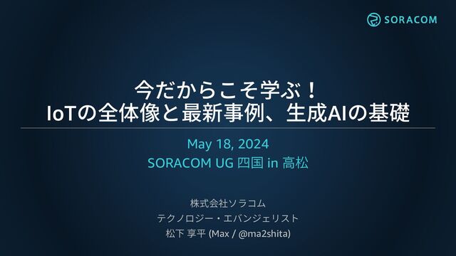 今だからこそ学ぶ! IoTの全体像と最新事例、生成AIの基礎 May 18, 2024 SORACOM UG 四国 in 高松