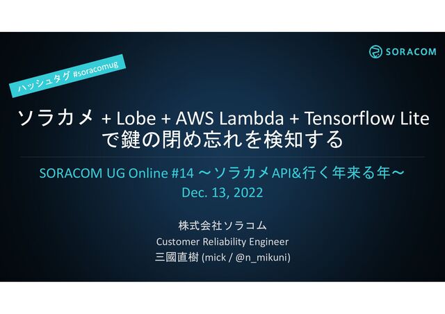 SORACOM UG Online #14 ~ソラカメAPI&行く年来る年~ Dec. 13, 2022 株式会社ソラコム Customer Reliability Engineer 三國直樹 (mick / @n_mikuni)