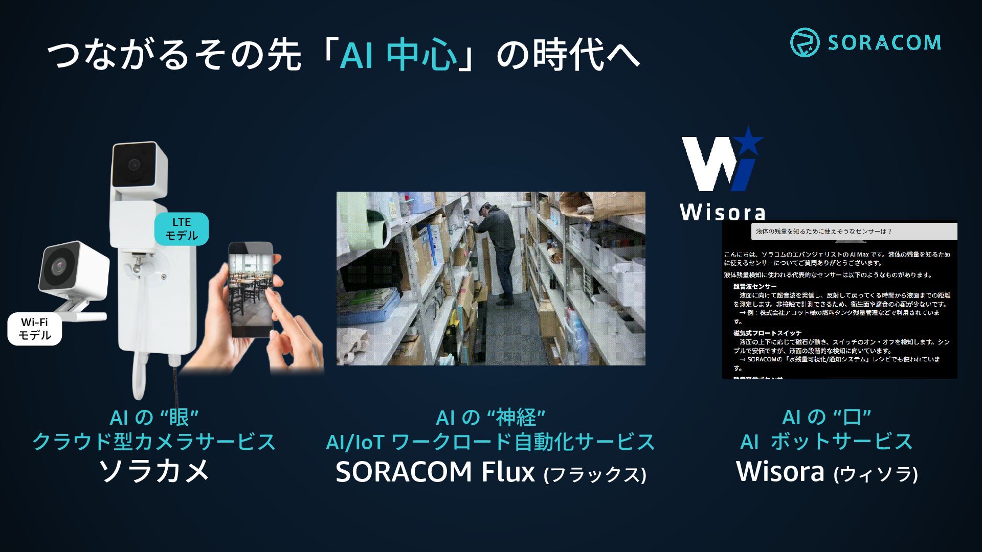 AI/IoT ワークロード自動化サービス SORACOM Flux (フラックス) LTE モデル Wi-Fi モデル AI の “口” AI ボットサービス Wisora (ウィソラ)