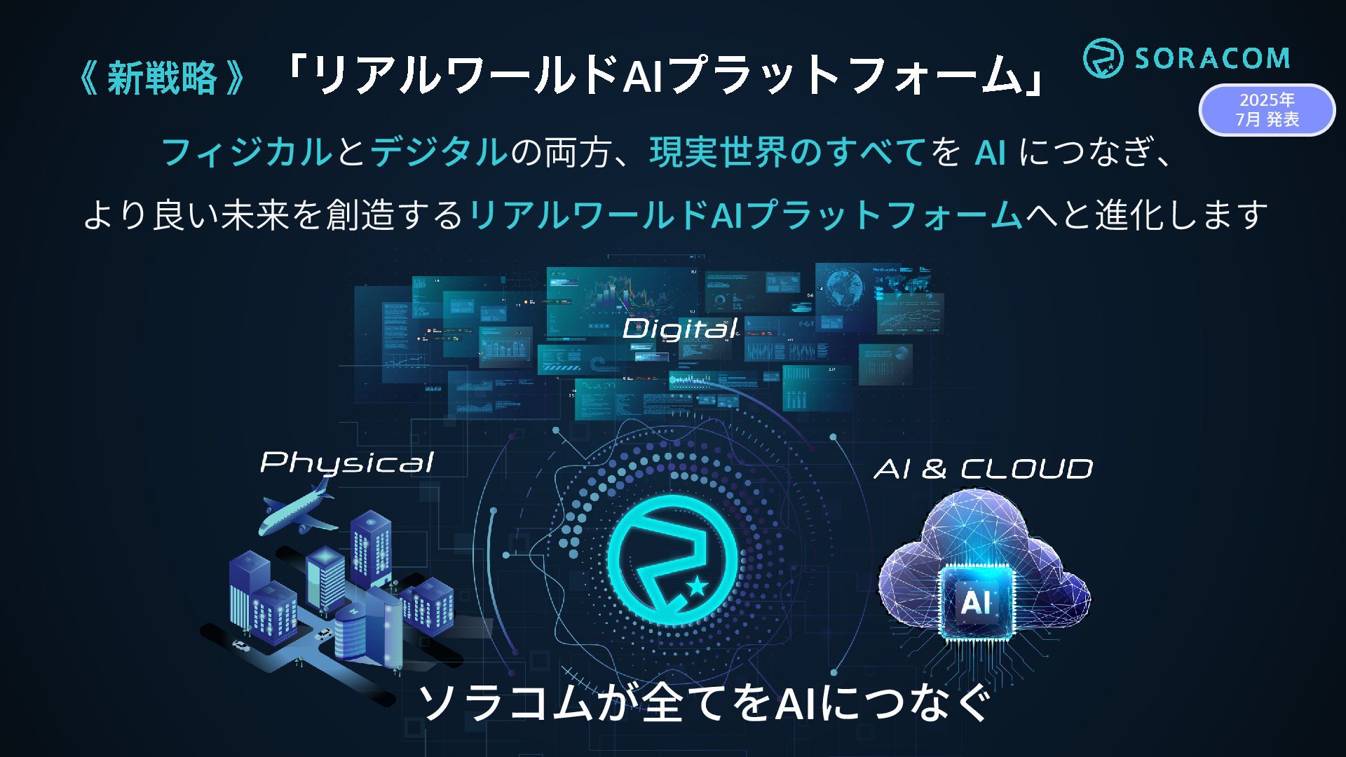 《 新戦略 》 「リアルワールド AIプラットフォーム」 フィジカルとデジタルの両方、現実世界のすべてを AI につなぎ、 より良い未来を創造するリアルワールドAIプラットフォームへと進化します ソラコムが全てをAIにつなぐ