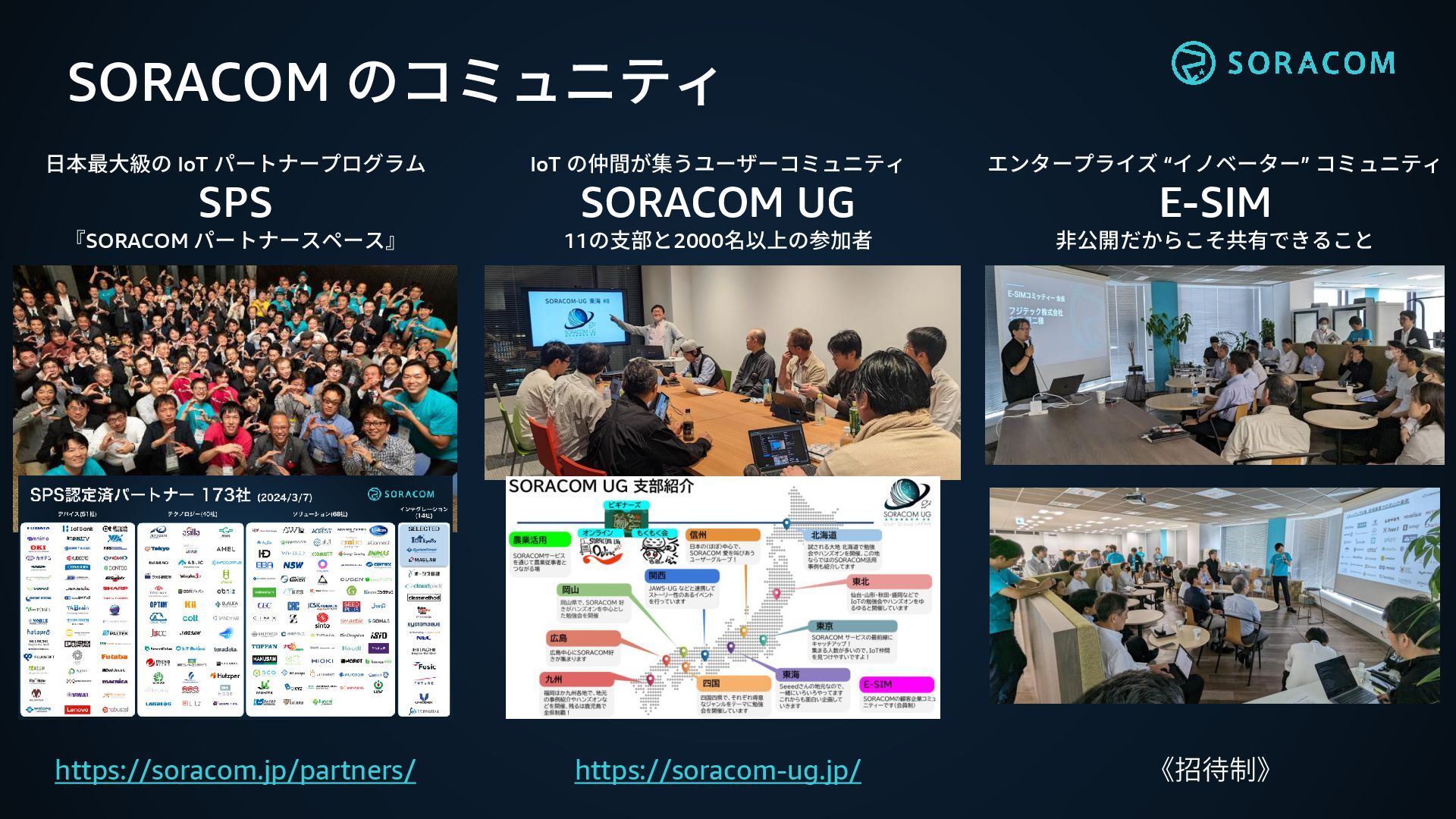 パートナープログラム SPS 『SORACOM パートナースペース』 https://soracom.jp/partners/ エンタープライズ “イノベーター” コミュニティ E-SIM 非公開だからこそ共有できること 《招待制》