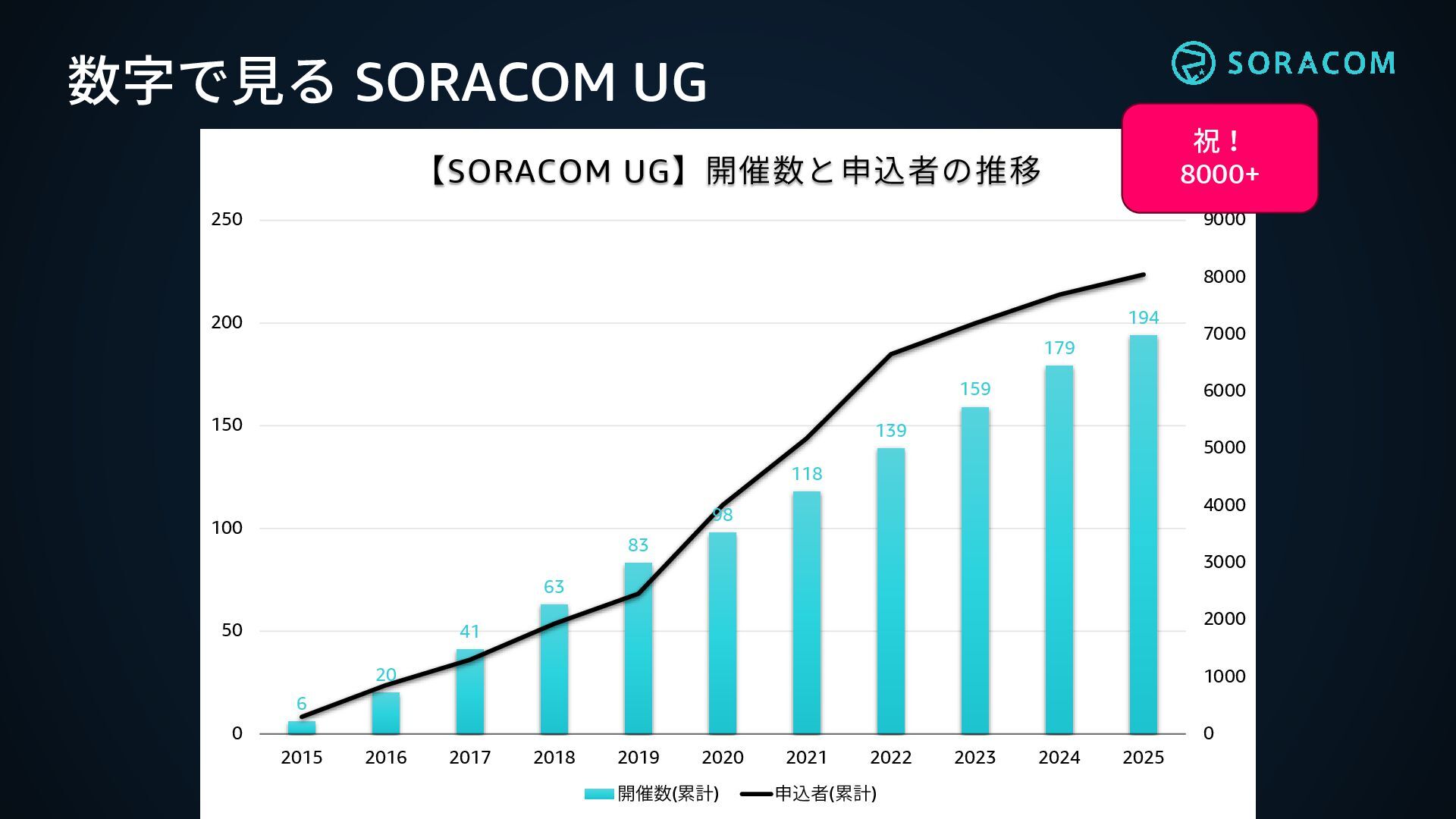 194 0 1000 2000 3000 4000 5000 6000 7000 8000 9000 0 50 100 150 200 250 2015 2016 2017 2018 2019 2020 2021 2022 2023 2024 2025 【SORACOM UG】開催数と申込者の推移 開催数(累計) 申込者(累計) 数字で見る SORACOM UG 祝! 8000+