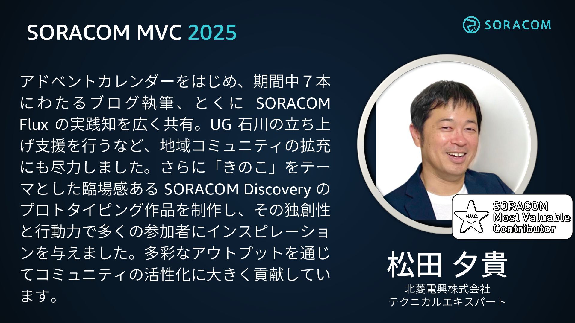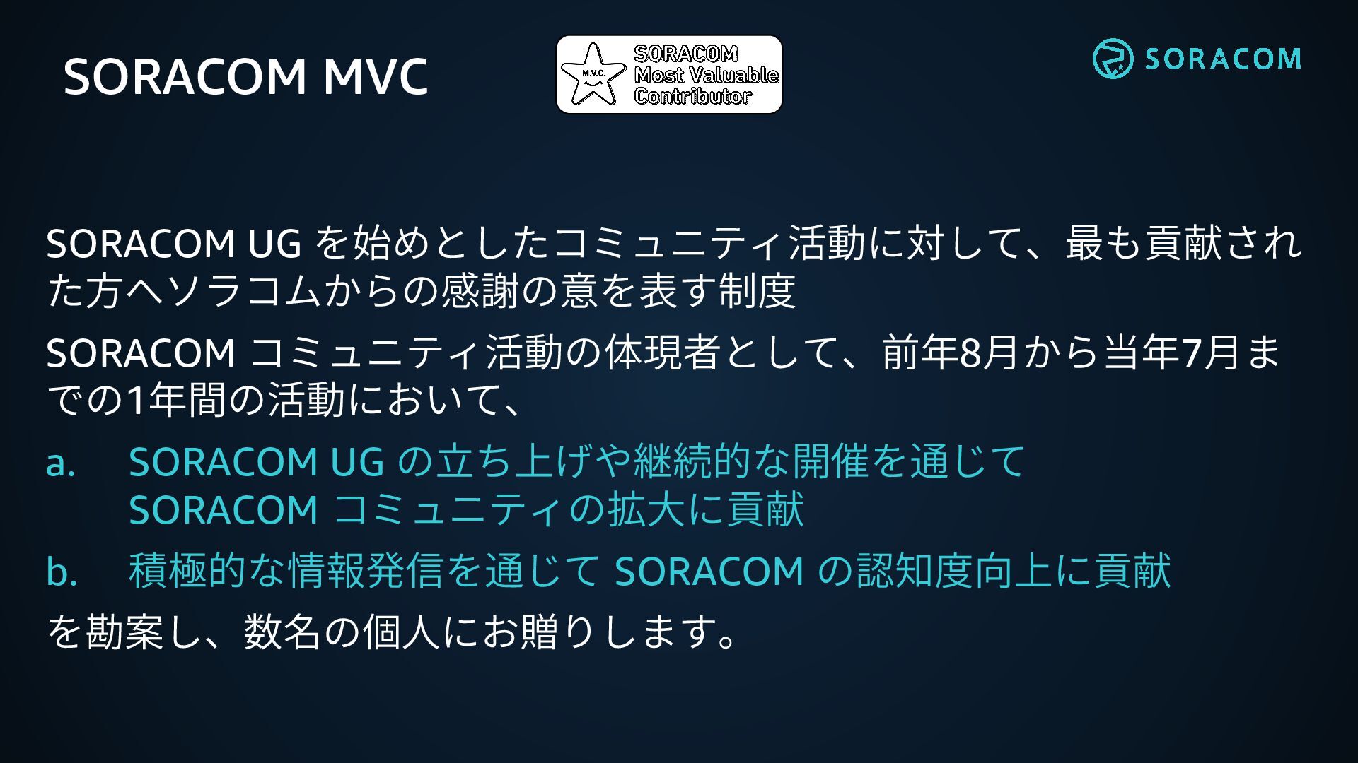 SORACOM MVC SORACOM UG を始めとしたコミュニティ活動に対して、最も貢献され た方へソラコムからの感謝の意を表す制度 SORACOM コミュニティ活動の体現者として、前年8月から当年7月ま での1年間の活動において、 a.
