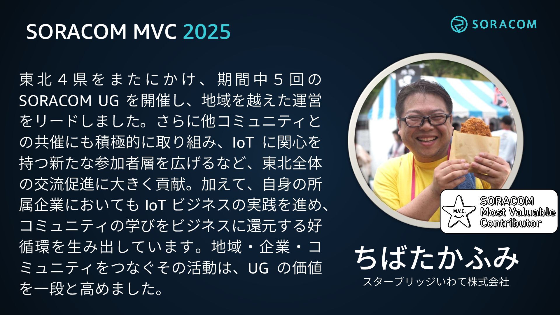 た に か け 、 期 間 中 5 回 の SORACOM UG を開催し、地域を越えた運営 をリードしました。さらに他コミュニティと の共催にも積極的に取り組み、IoT に関心を 持つ新たな参加者層を広げるなど、東北全体 の交流促進に大きく貢献。加えて、自身の所 属企業においても IoT ビジネスの実践を進め、 コミュニティの学びをビジネスに還元する好 循環を生み出しています。地域・企業・コ ミュニティをつなぐその活動は、UG の価値 を一段と高めました。 ? ちばたかふみ スターブリッジいわて株式会社