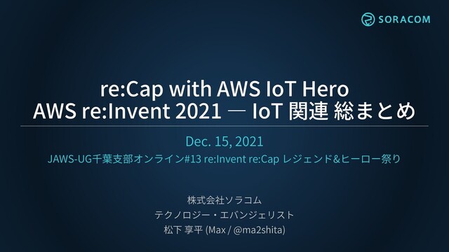 2021年12月15日(水)開催の JAWS-UG千葉支部オンライン#13 re:Invent re:Cap レジェンド&ヒーロー祭り にて、ソラコム松下が発表した「AWS reInvent 2021 IoT 関連総まとめ」の資料です。