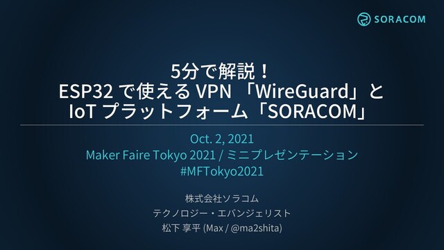 2021年10月2日(土)の Maker Faire Tokyo 2021のミニプレゼンテーションで、松下が発表した「5分で解説!ESP32で使えるVPN「WireGuard」とIoTプラットフォーム「SORACOM」」の資料です。