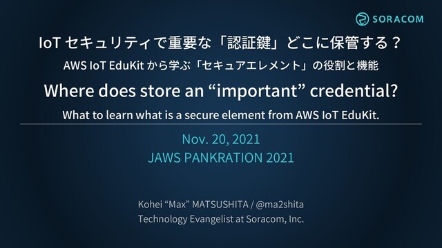 “important” credential? What to learn what is a secure element from AWS IoT EduKit. Nov. 20, 2021 JAWS PANKRATION 2021 Kohei “Max” MATSUSHITA / @ma2shita Technology Evangelist at Soracom, Inc.