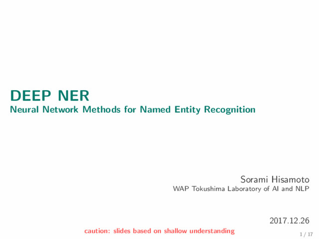 Hovy 2016] • TensorFlow • zseder/hunvec • [Pajkossy & Zsder 2016]“The Hunvec Framework For NN-CRF-based Sequential Tagging” • Theano and Pylearn2 • monikkinom/ner-lstm • [Athavale et al. 2016]“Towards Deep Learning in Hindi NER: An approach to tackle the Labelled Data Scarcity” • BiLSTM • TensorFlow 16 / 17