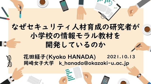 なぜセキュリティ人材育成の研究者が 小学校の情報モラル教材を 開発しているのか 2021.10.13 花田経子(Kyoko HANADA) 岡崎女子大学