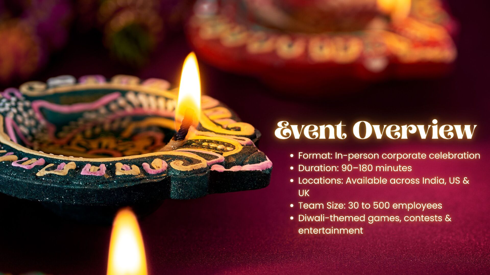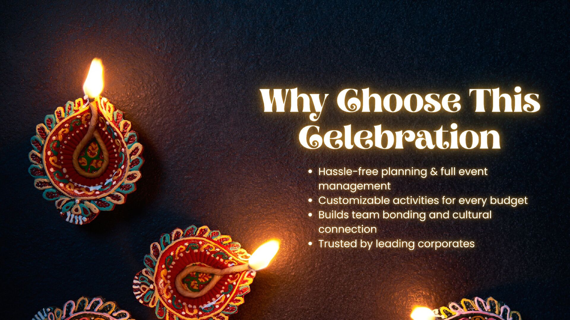 We specialize in creating memorable Diwali Office Celebration Ideas, blending fun, culture, and team bonding. Our office parties feature engaging games, contests, and professional entertainment, including DJs, live performances, and photography. Designed for teams of 30–500, each event is fully customizable, hassle-free, and crafted to foster togetherness, joy, and a festive spirit that employees will cherish.