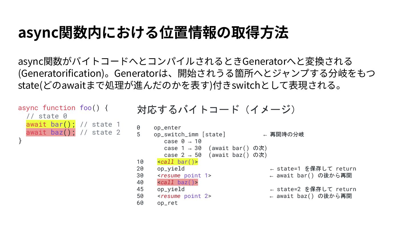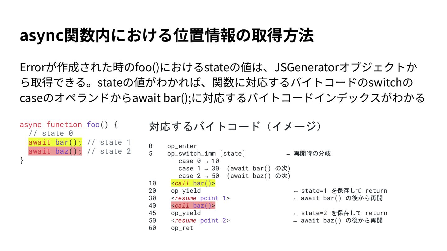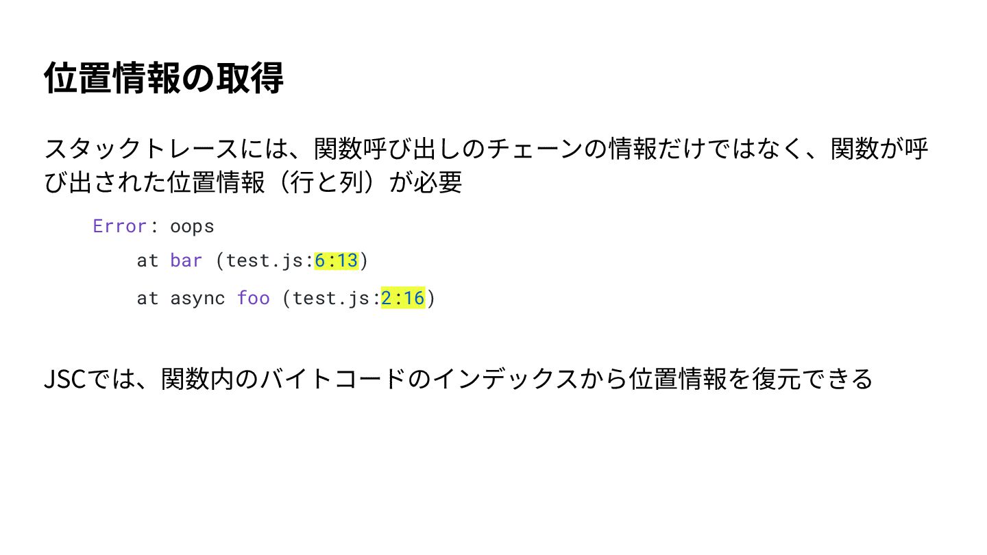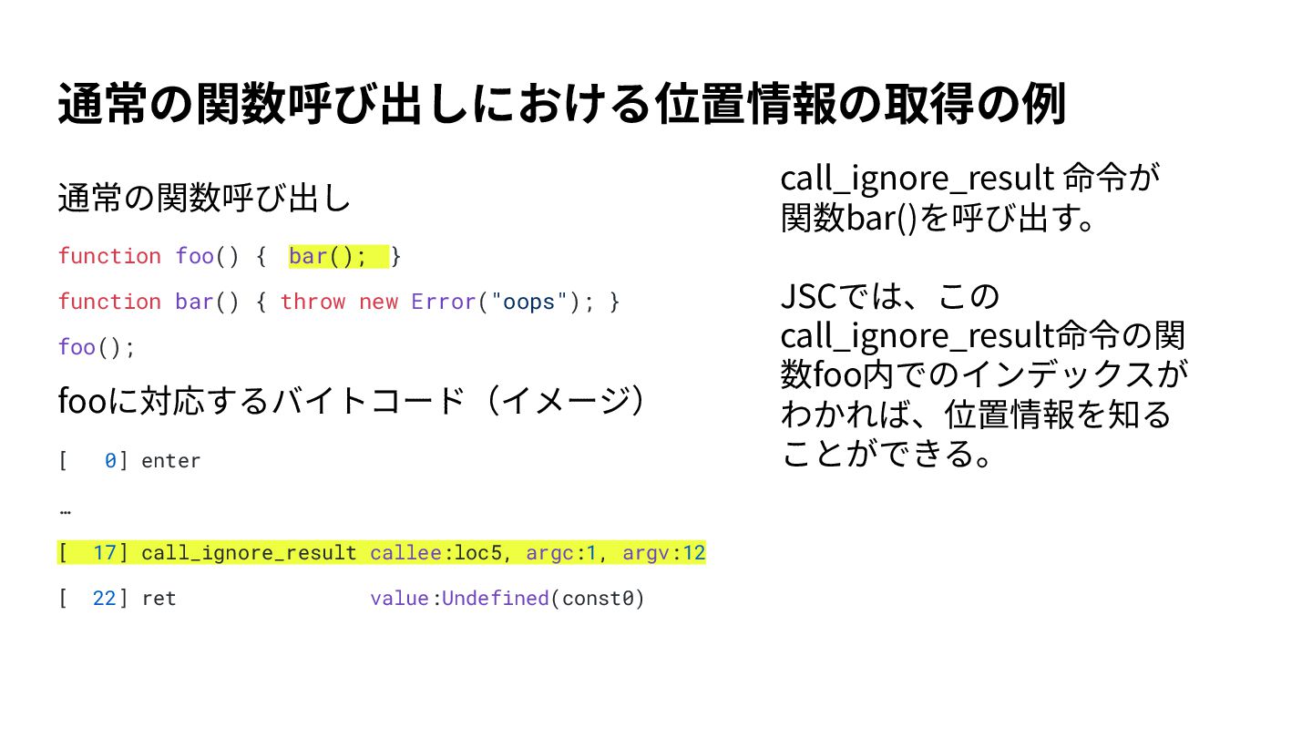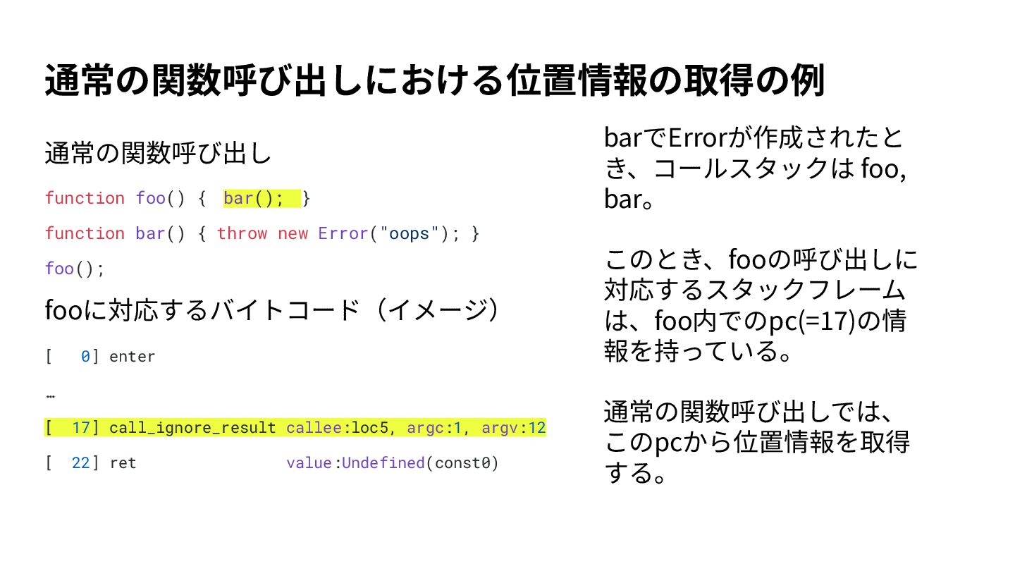 } foo(); fooに対応するバイトコード(イメージ) [ 0] enter … [ 17] call_ignore_result callee:loc5, argc:1, argv:12 [ 22] ret value:Undefined(const0) 通常の関数呼び出しにおける位置情報の取得の例 barでErrorが作成されたと き、コールスタックは foo, bar。 このとき、fooの呼び出しに 対応するスタックフレーム は、foo内でのpc(=17)の情 報を持っている。 通常の関数呼び出しでは、 このpcから位置情報を取得 する。