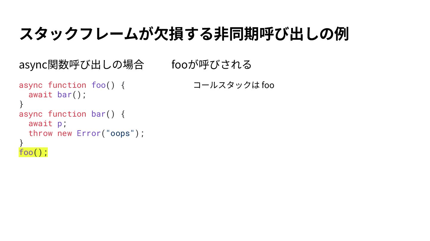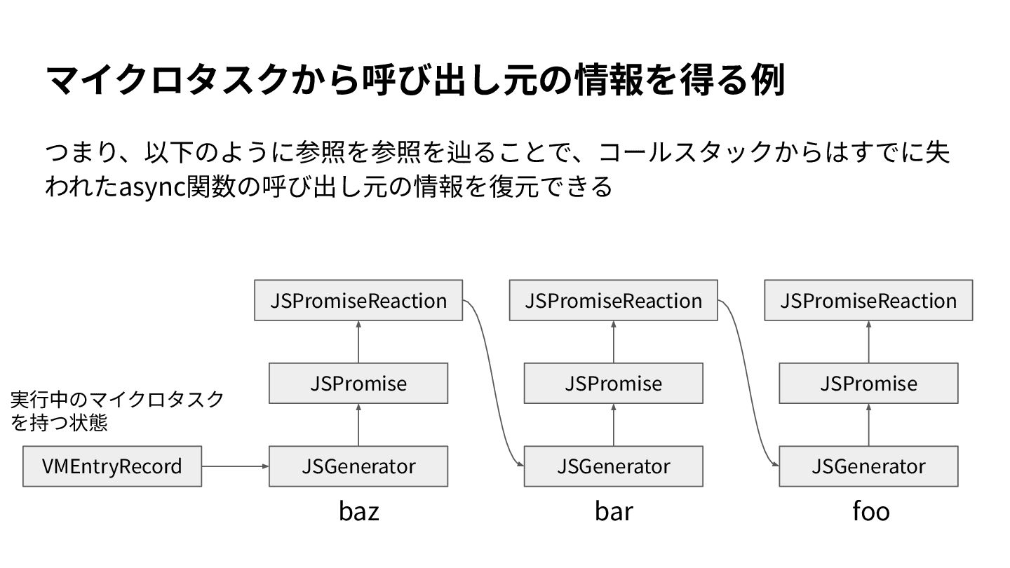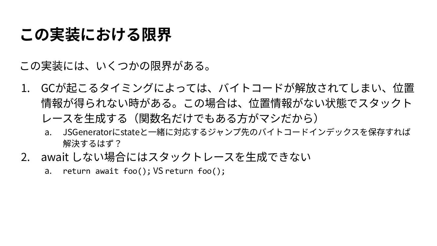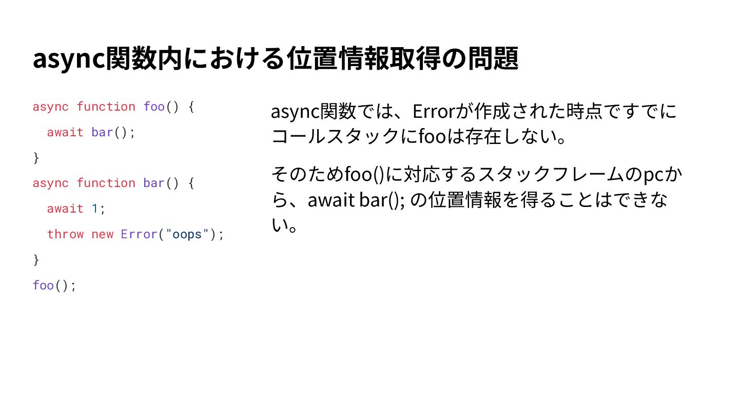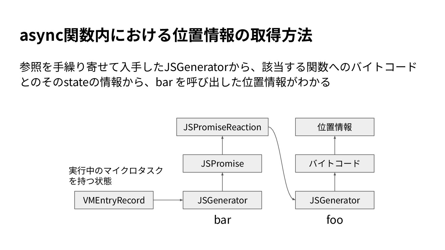 } foo(); fooに対応するバイトコード(イメージ) [ 0] enter … [ 17] call_ignore_result callee:loc5, argc:1, argv:12 [ 22] ret value:Undefined(const0) 通常の関数呼び出しにおける位置情報の取得の例 barでErrorが作成されたと き、コールスタックは foo, bar。 このとき、fooの呼び出しに 対応するスタックフレーム は、foo内でのpc(=17)の情 報を持っている。 通常の関数呼び出しでは、 このpcから位置情報を取得 する。