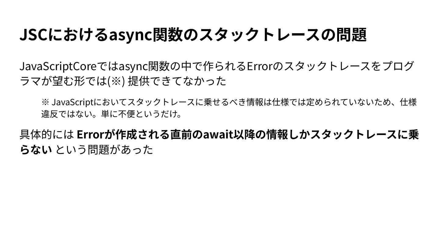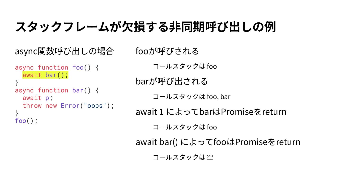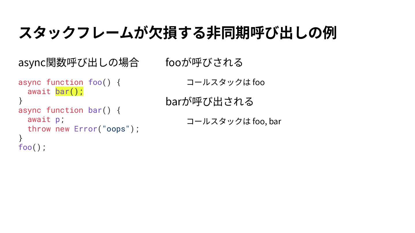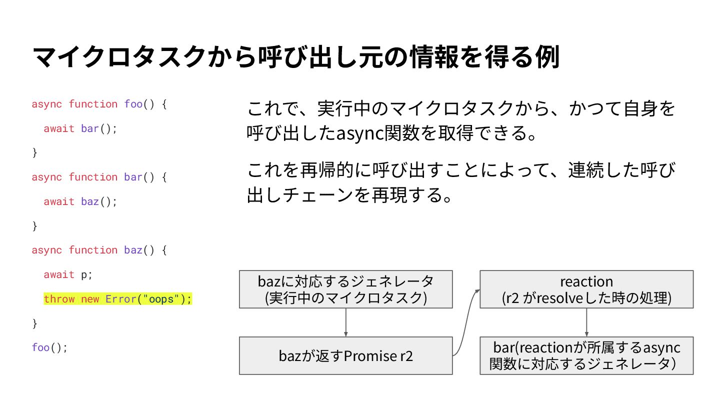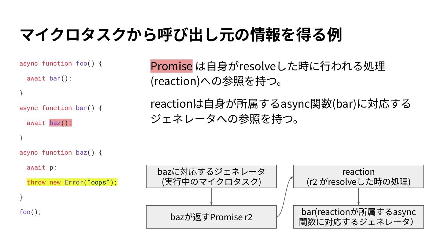 } foo(); fooに対応するバイトコード(イメージ) [ 0] enter … [ 17] call_ignore_result callee:loc5, argc:1, argv:12 [ 22] ret value:Undefined(const0) 通常の関数呼び出しにおける位置情報の取得の例 barでErrorが作成されたと き、コールスタックは foo, bar。 このとき、fooの呼び出しに 対応するスタックフレーム は、foo内でのpc(=17)の情 報を持っている。 通常の関数呼び出しでは、 このpcから位置情報を取得 する。