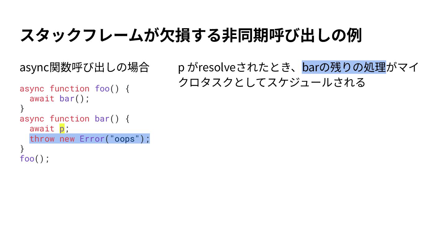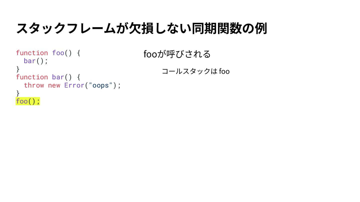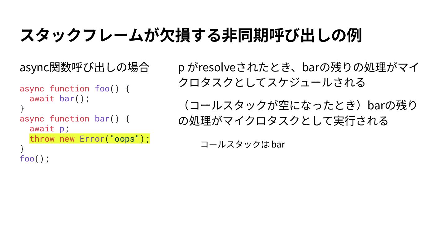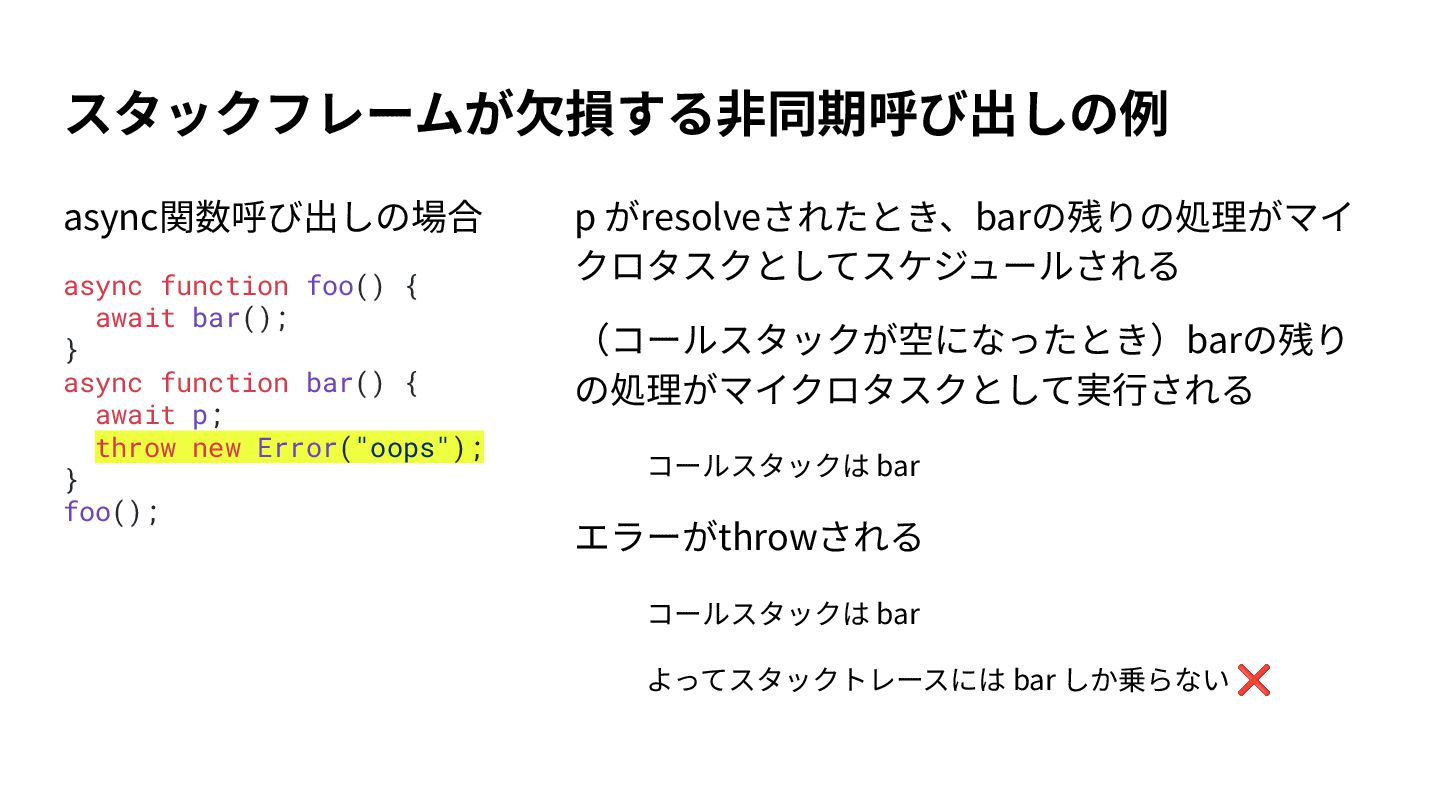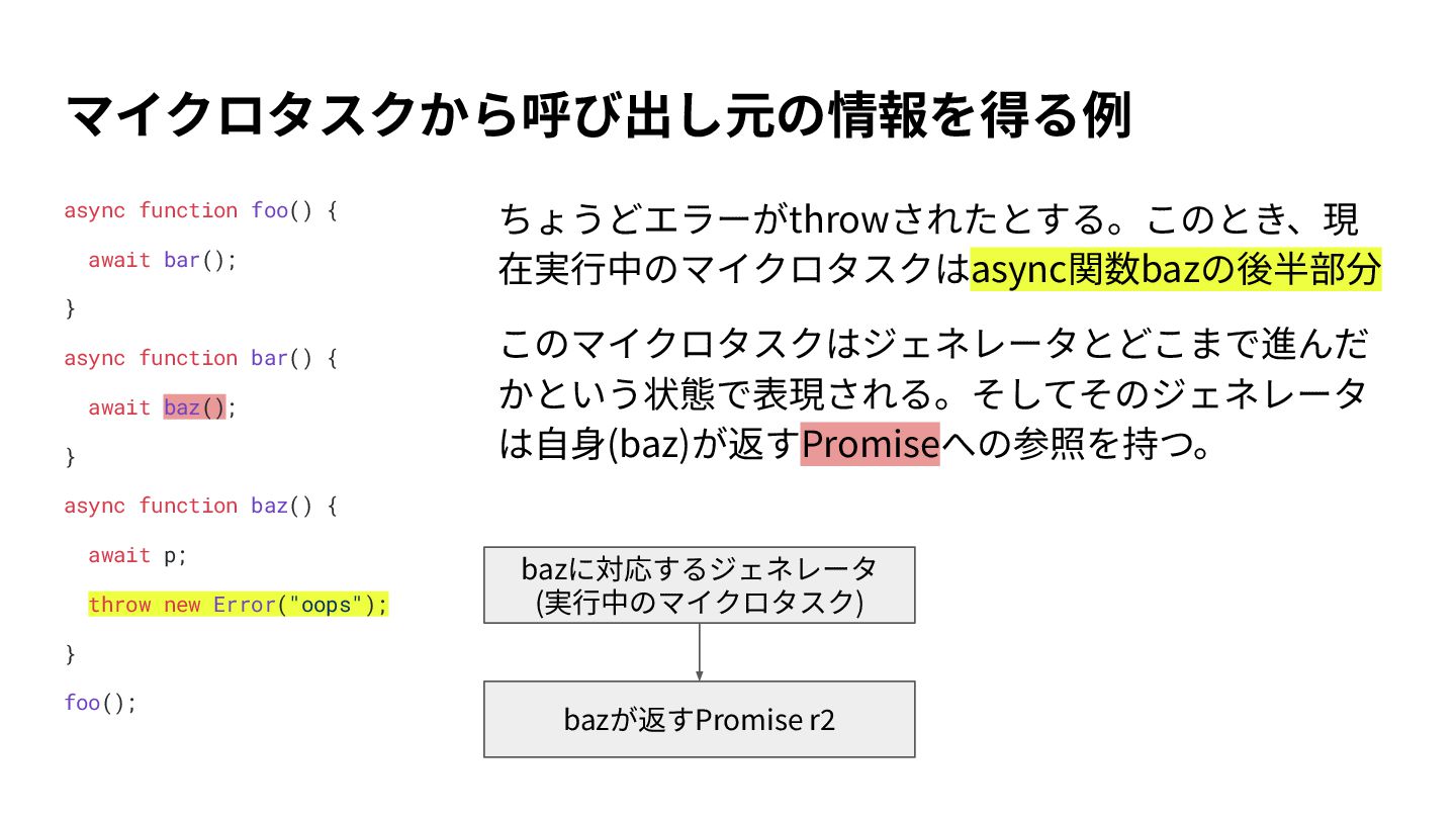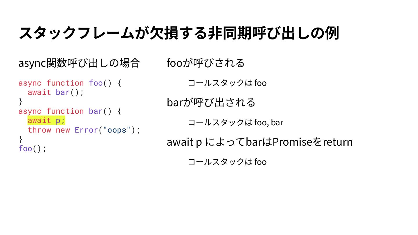 } foo(); fooに対応するバイトコード(イメージ) [ 0] enter … [ 17] call_ignore_result callee:loc5, argc:1, argv:12 [ 22] ret value:Undefined(const0) 通常の関数呼び出しにおける位置情報の取得の例 barでErrorが作成されたと き、コールスタックは foo, bar。 このとき、fooの呼び出しに 対応するスタックフレーム は、foo内でのpc(=17)の情 報を持っている。 通常の関数呼び出しでは、 このpcから位置情報を取得 する。