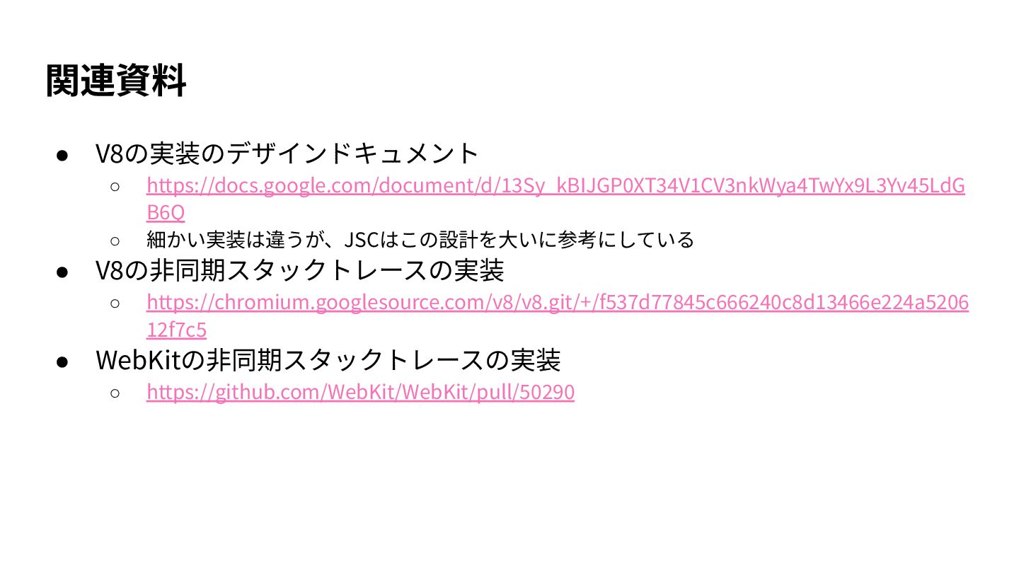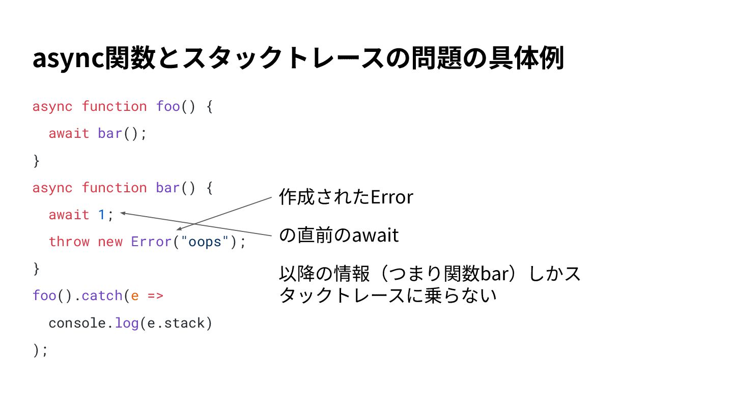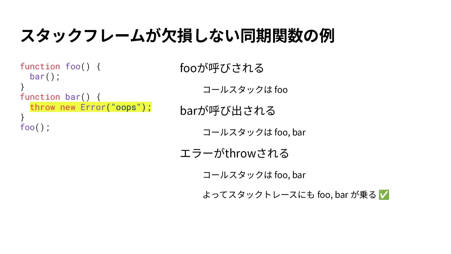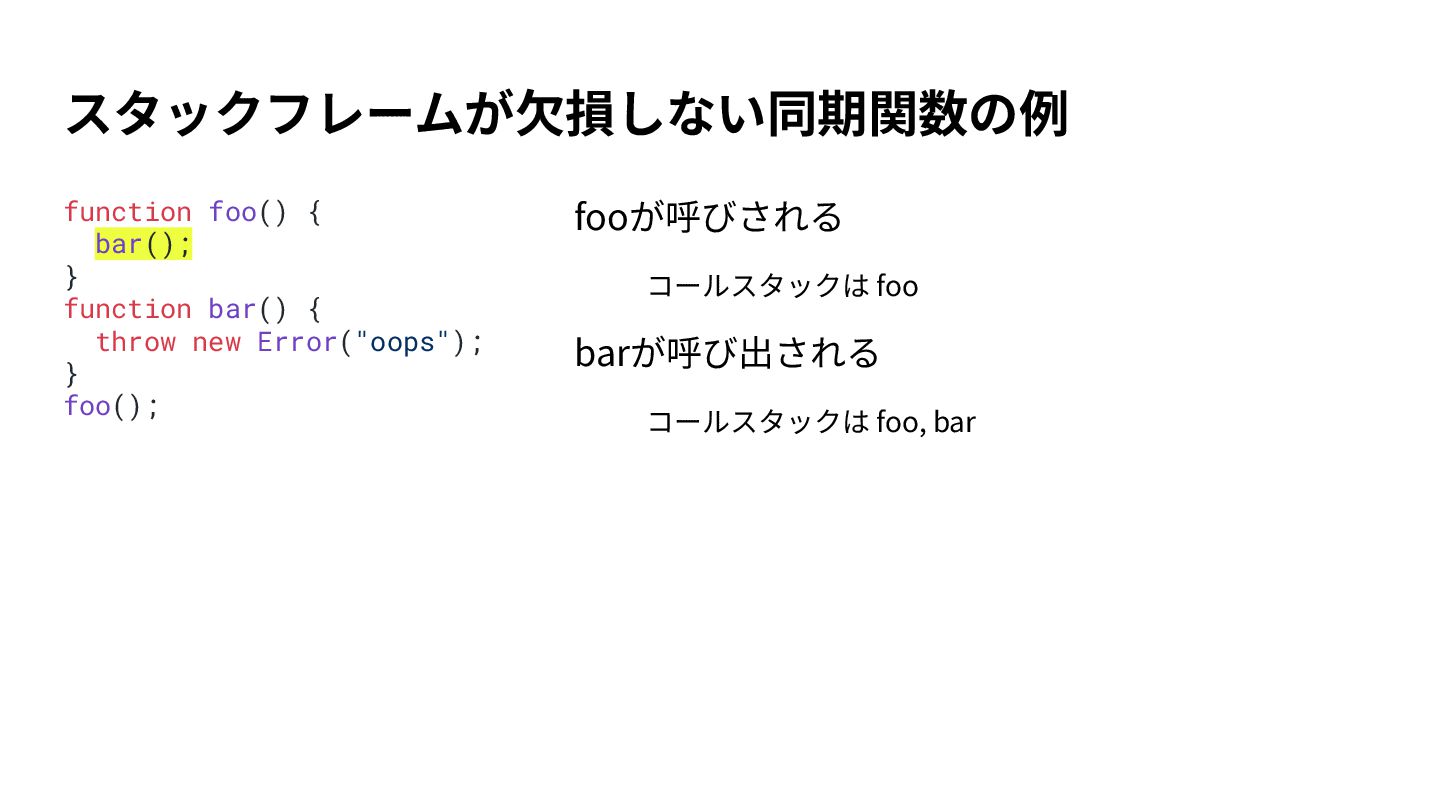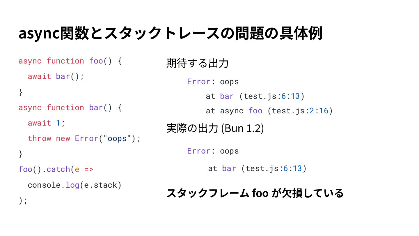 } foo(); fooに対応するバイトコード(イメージ) [ 0] enter … [ 17] call_ignore_result callee:loc5, argc:1, argv:12 [ 22] ret value:Undefined(const0) 通常の関数呼び出しにおける位置情報の取得の例 barでErrorが作成されたと き、コールスタックは foo, bar。 このとき、fooの呼び出しに 対応するスタックフレーム は、foo内でのpc(=17)の情 報を持っている。 通常の関数呼び出しでは、 このpcから位置情報を取得 する。