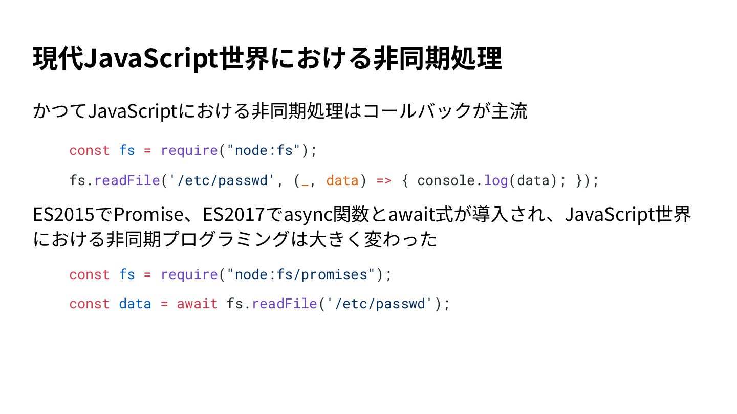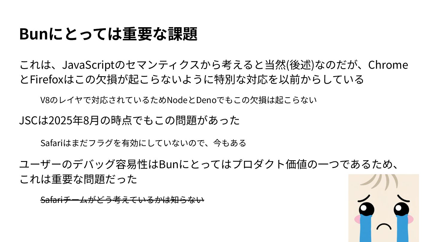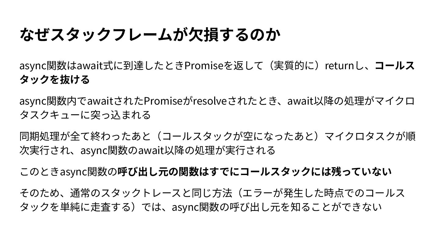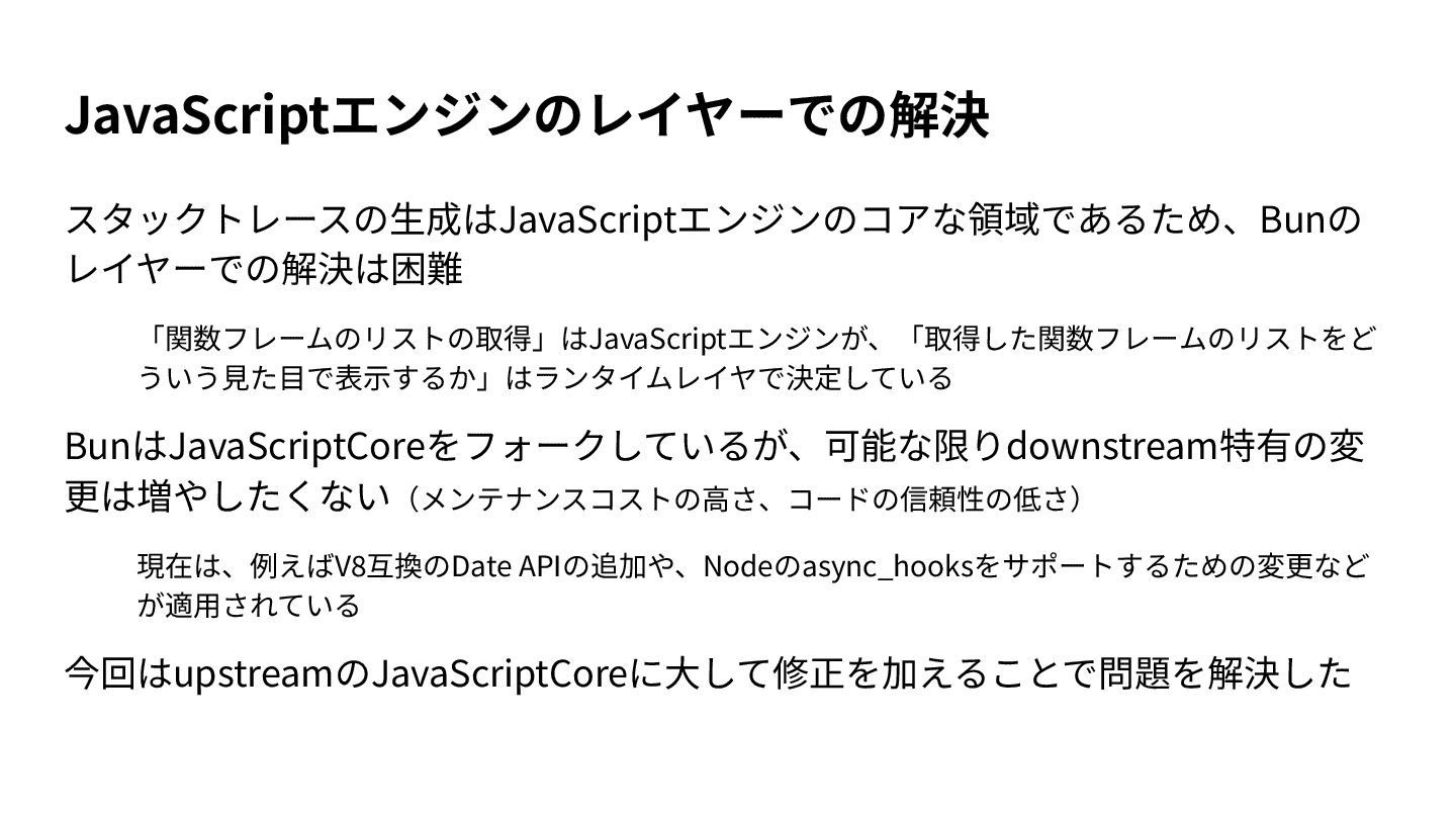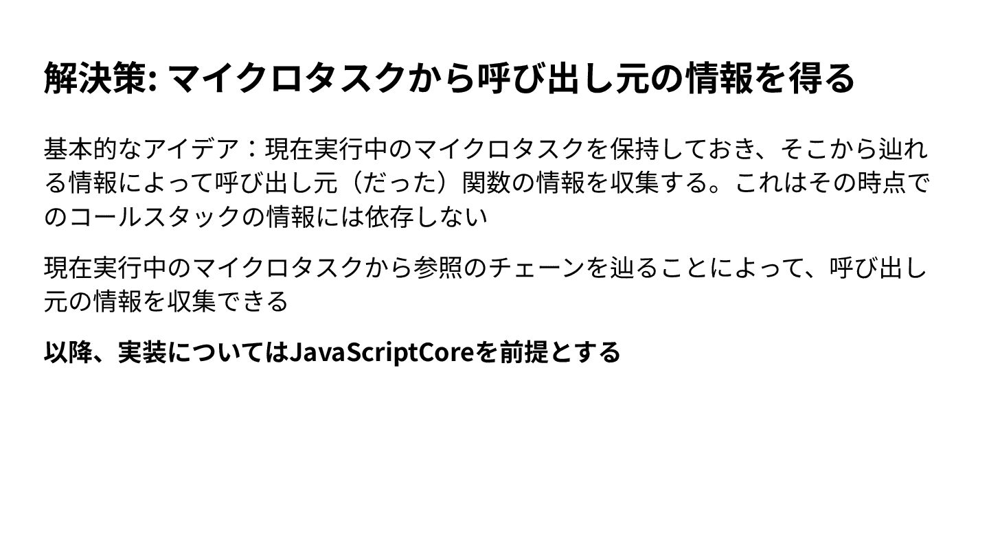 } foo(); fooに対応するバイトコード(イメージ) [ 0] enter … [ 17] call_ignore_result callee:loc5, argc:1, argv:12 [ 22] ret value:Undefined(const0) 通常の関数呼び出しにおける位置情報の取得の例 barでErrorが作成されたと き、コールスタックは foo, bar。 このとき、fooの呼び出しに 対応するスタックフレーム は、foo内でのpc(=17)の情 報を持っている。 通常の関数呼び出しでは、 このpcから位置情報を取得 する。