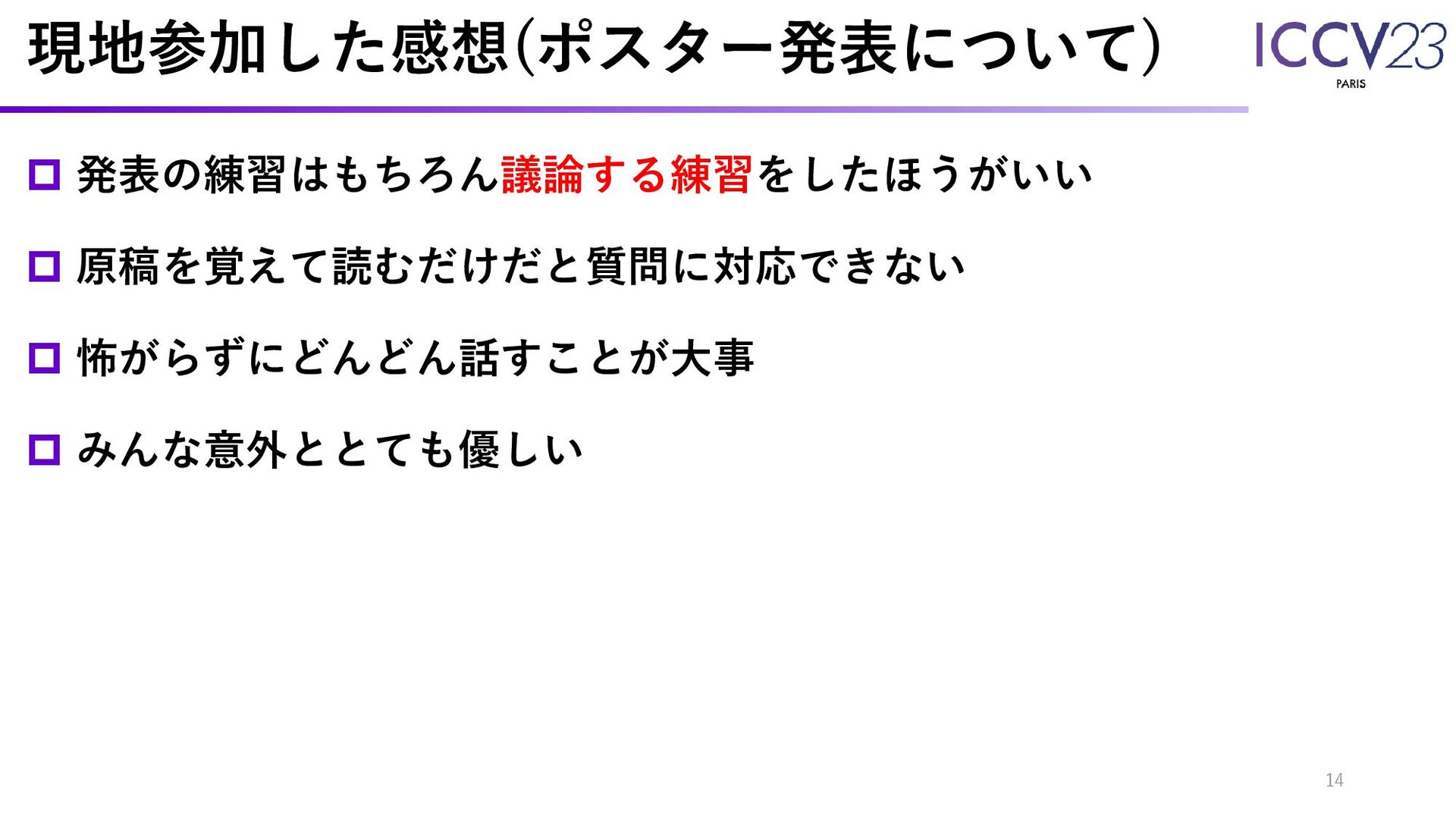 現地参加した感想(ポスター発表について) 発表の練習はもちろん議論する練習をしたほうがいい 原稿を覚えて読むだけだと質問に対応できない 怖がらずにどんどん話すことが大事 みんな意外ととても優しい 14