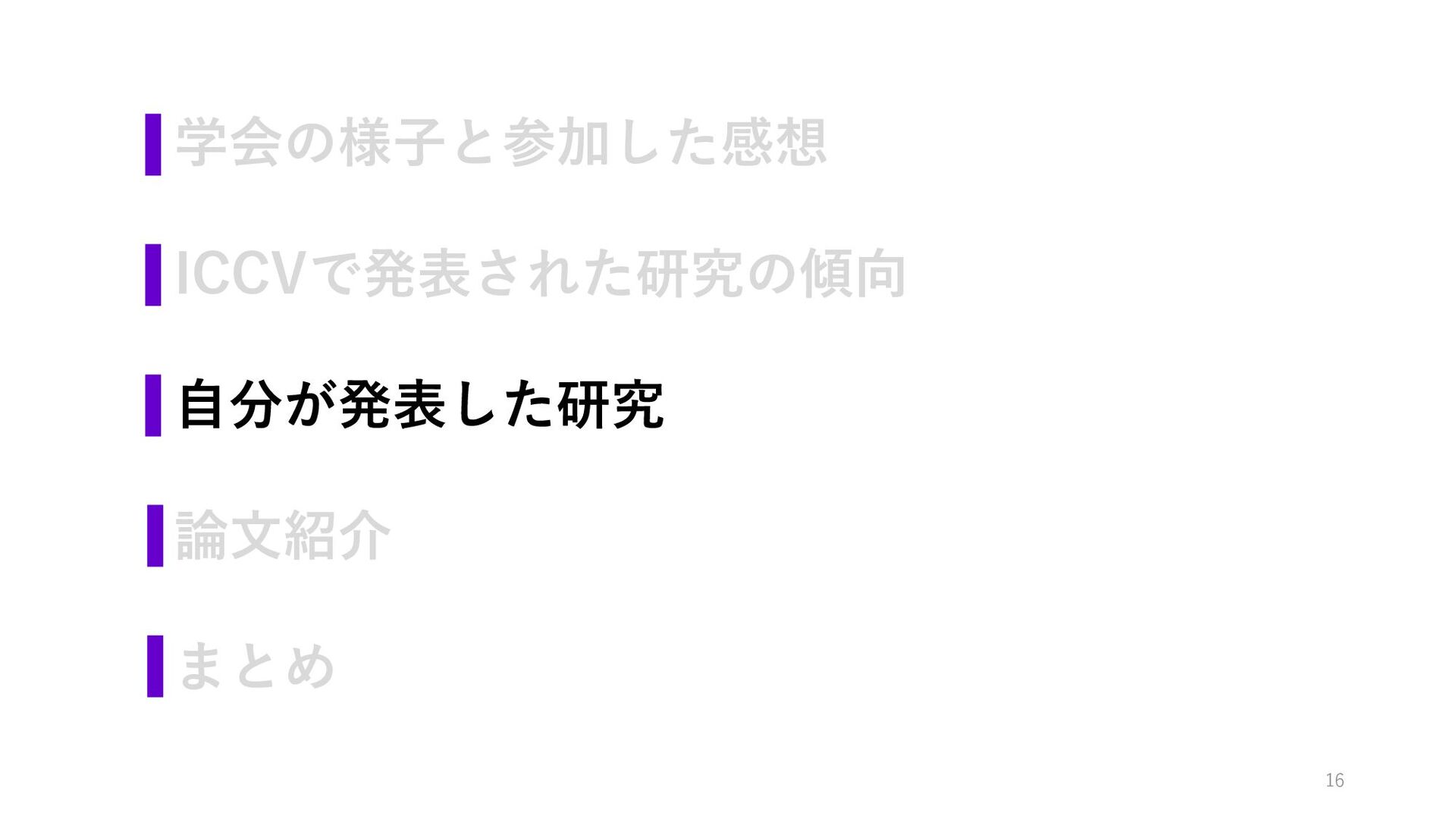 学会の様子と参加した感想 ICCVで発表された研究の傾向 自分が発表した研究 論文紹介 まとめ 16