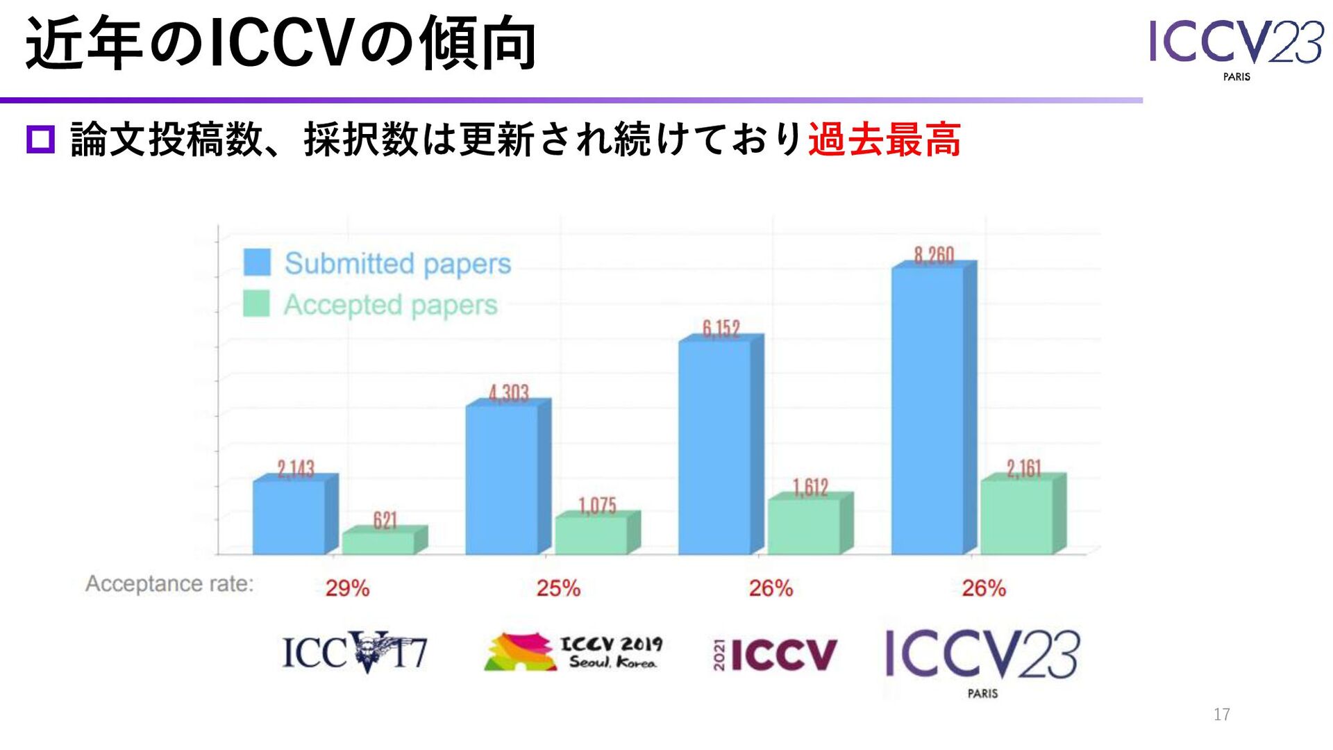 近年のICCVの傾向 論文投稿数、採択数は更新され続けており過去最高 17