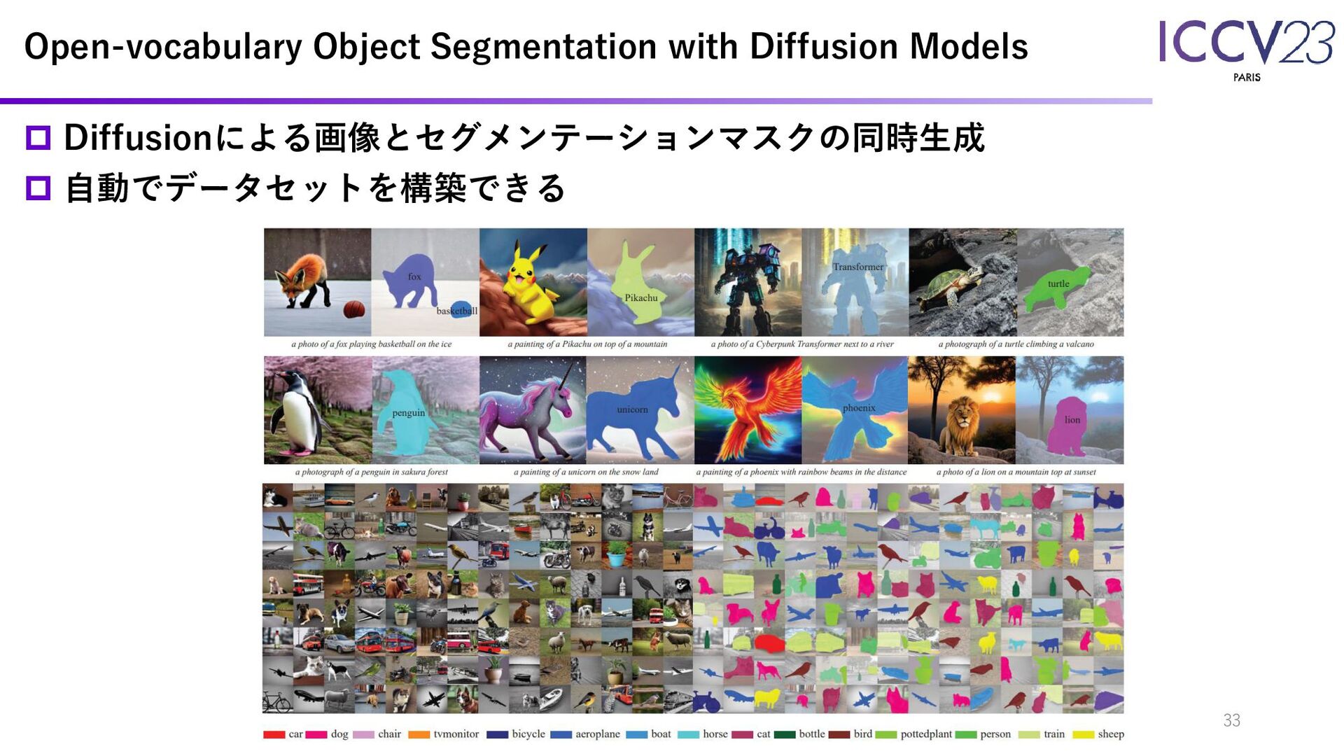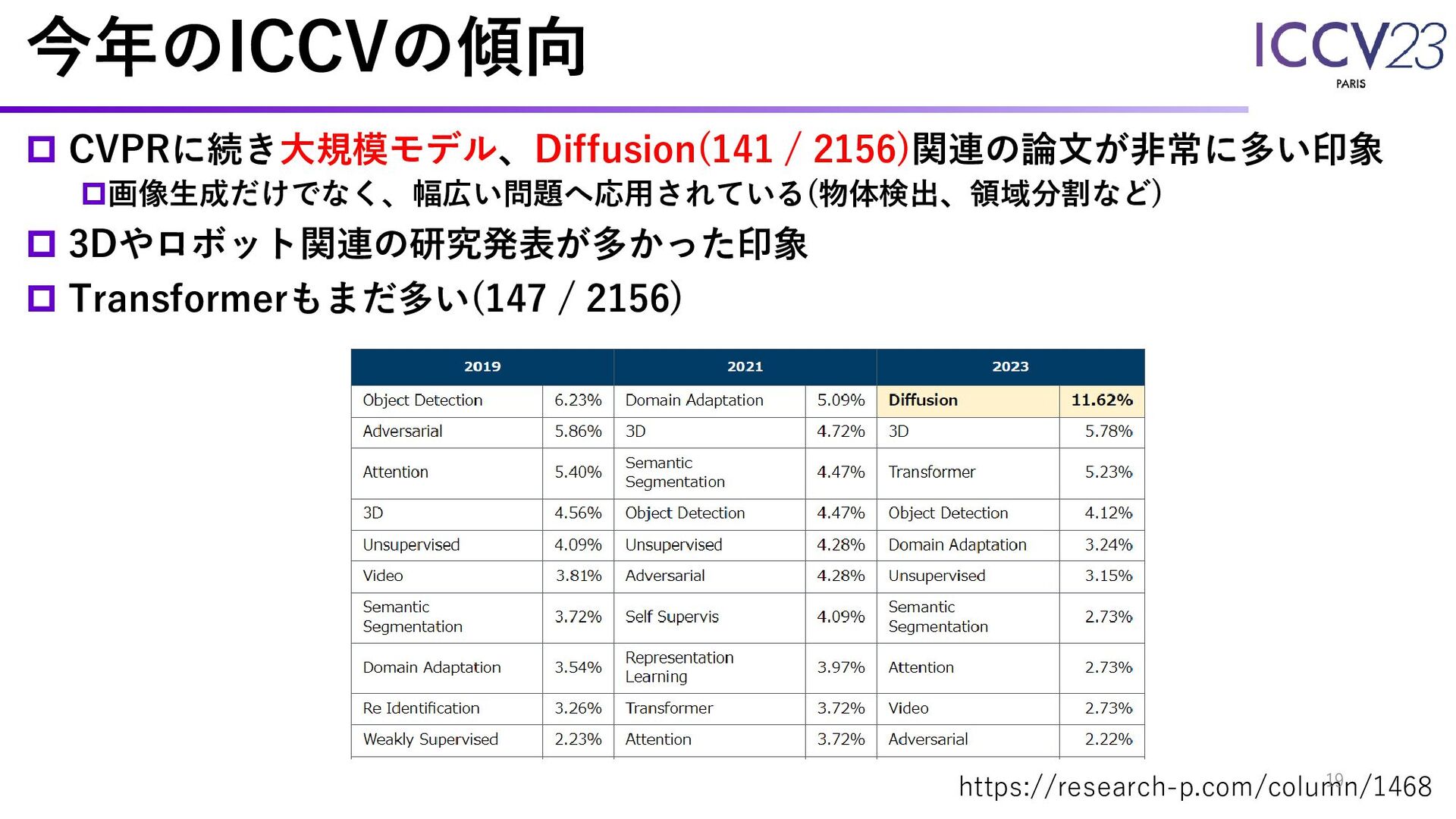 今年のICCVの傾向 CVPRに続き大規模モデル、Diffusion(141 / 2156)関連の論文が非常に多い印象 画像生成だけでなく、幅広い問題へ応用されている(物体検出、領域分割など) 3Dやロボット関連の研究発表が多かった印象 Transformerもまだ多い(147