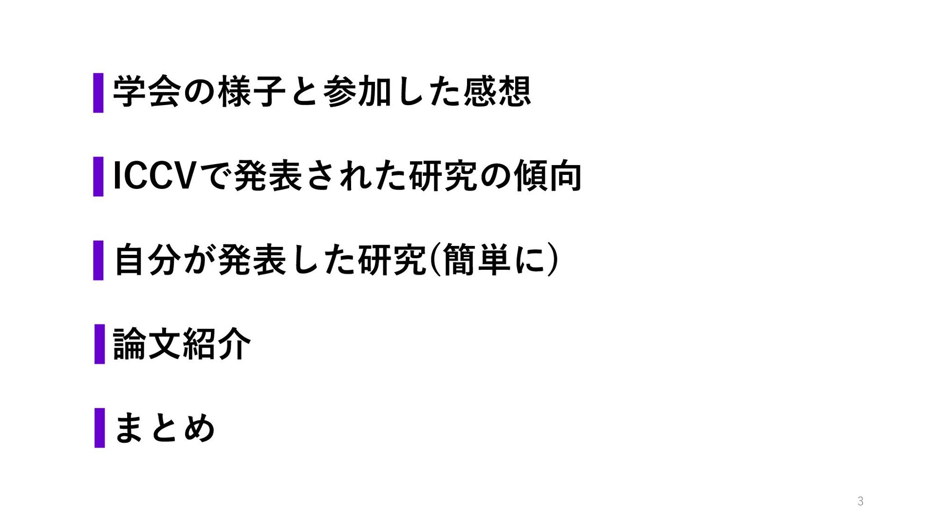 学会の様子と参加した感想 ICCVで発表された研究の傾向 自分が発表した研究(簡単に) 論文紹介 まとめ 3