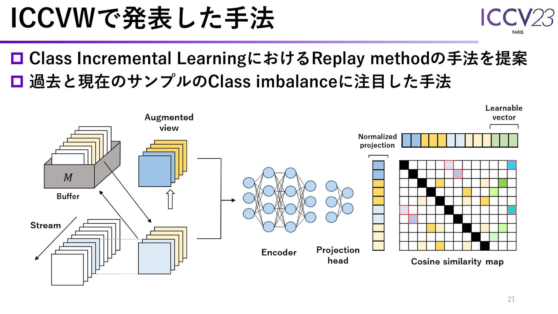 ICCVWで発表した手法 Class Incremental LearningにおけるReplay methodの手法を提案 過去と現在のサンプルのClass imbalanceに注目した手法 21